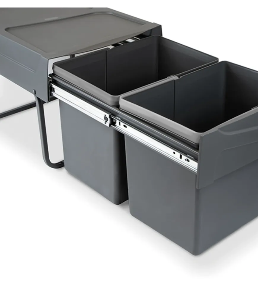 Pattumiera per raccolta differenziata rimovibile ideale per riciclare e classificare i rifiuti domestici. Sono progettati per essere integrati nei mobili della cucina offrendo un accesso più semplice ai bidoni. Ha una capacità totali di 30 litri ed è valido per moduli con dimensioni minime utili di 364 mm di larghezza, 500 mm di profondità e 310 mm di altezza. La struttura rimovibile di questo contenitore della spazzatura è fissata sul fondo dei moduli, consentendo un’estrazione totale regolare manualmente grazie alle guide a sfera incorporate. Si caratterizza per la sua facile installazione mediante le viti incluse nel prodotto. Il set include due contenitori rimovibili da 15 litri con una semplice maniglia per una facile rimozione. Realizzato in acciaio e plastica grigio antracite.