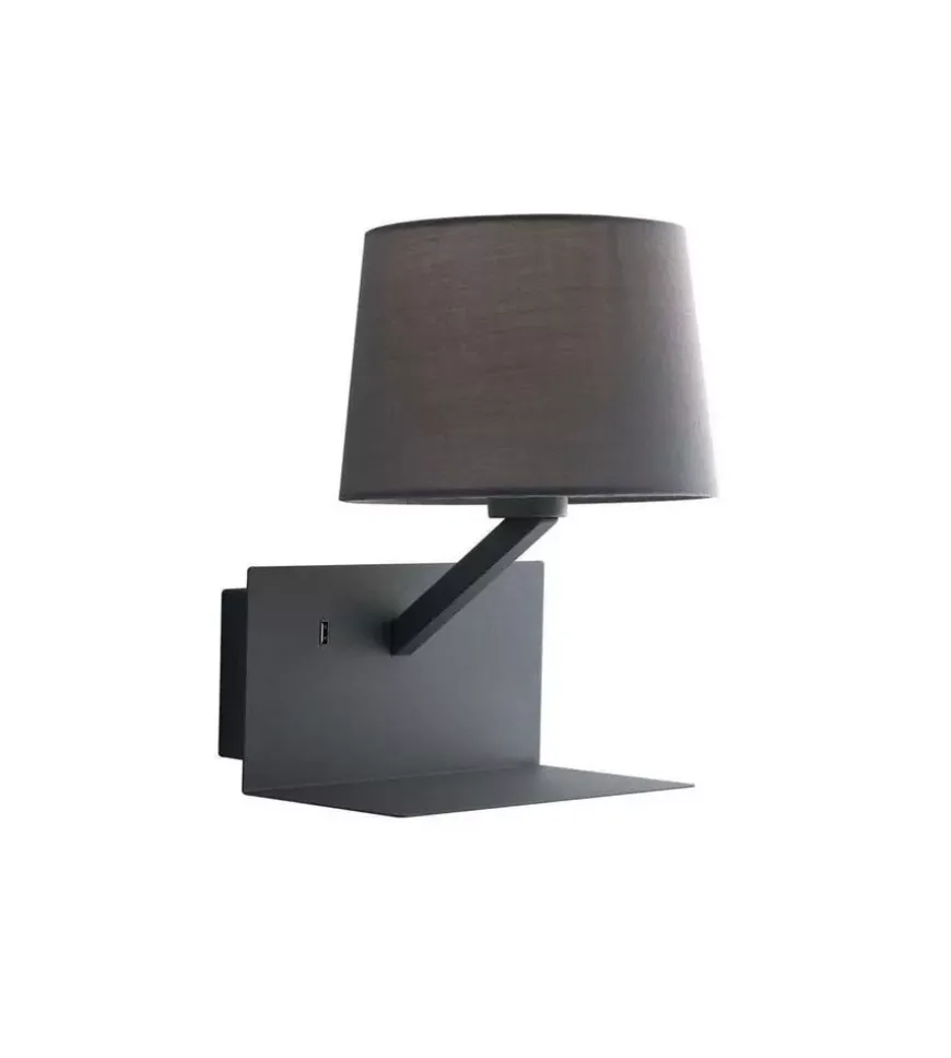 Applique “Ciak” in metallo grigio con attacco USB e paralume orientabile in base alle esigenze. Il ripiano permette di posizionare il telefono mentre รจ in carica. Attacco lampadina, non inclusa, E27. Max 40W