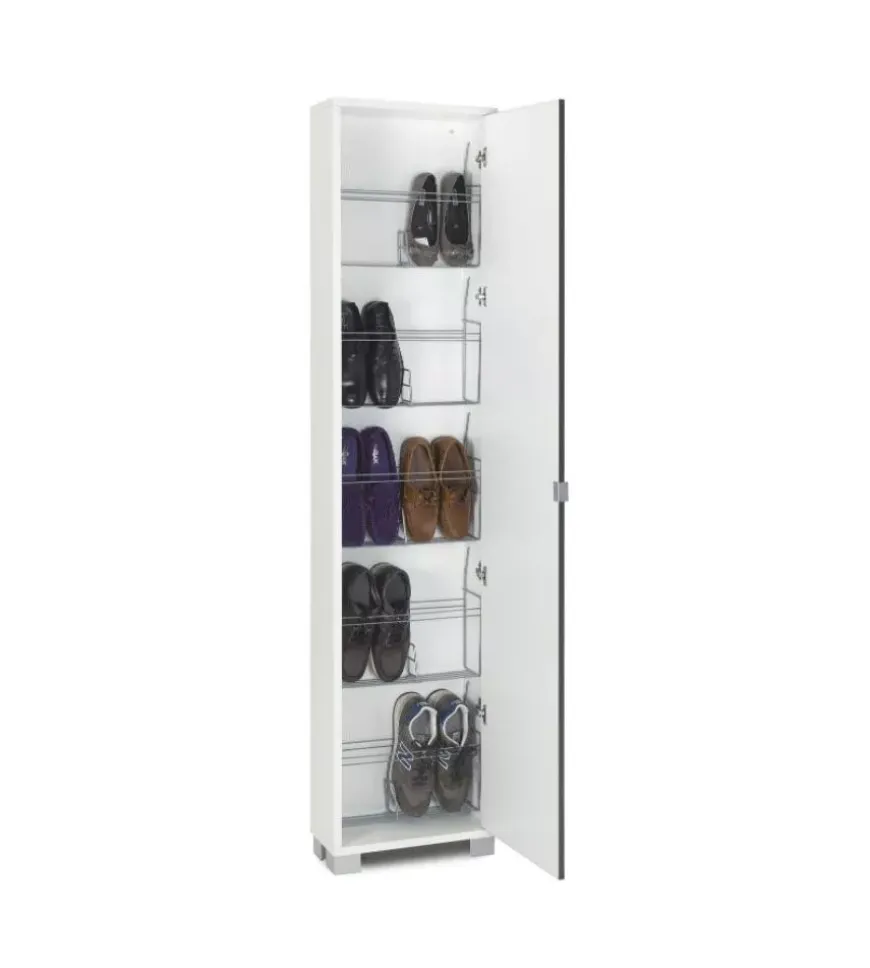 Colonna porta scarpe con struttura bianca e anta a specchio a figura intera.