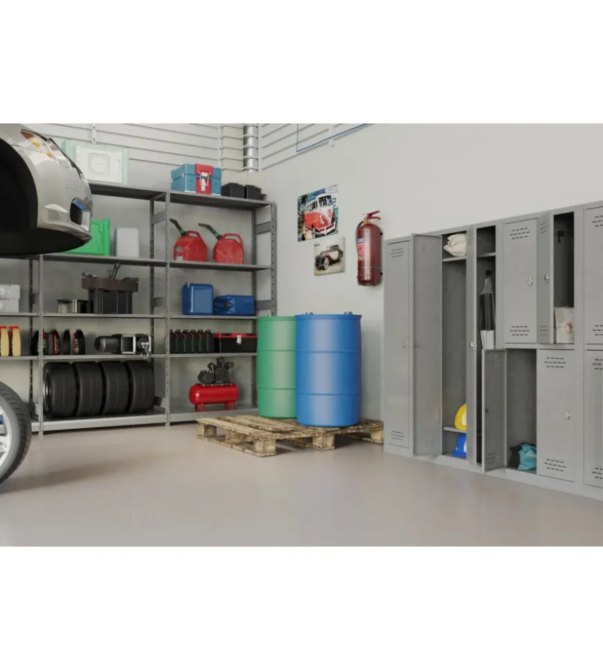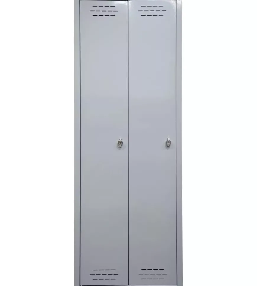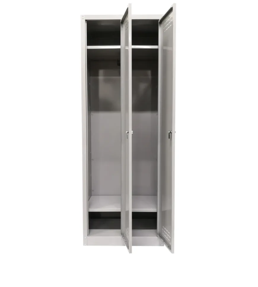 All’interno, l’armadio è equipaggiato con un pannello separatore centrale e ripiani superiore ed inferiore in metallo, montabili tramite un sistema ad incastro. Sono inclusi anche due appendiabiti in plastica per una gestione flessibile degli spazi. Il colore dell’armadio è un elegante grigio chiaro, ottenuto mediante verniciatura a polvere epossidica, che conferisce una finitura resistente e moderna. L’armadio è conforme alla Dichiarazione di conformità D.Lgs.81/2008, assicurando il rispetto delle normative di sicurezza e qualità.