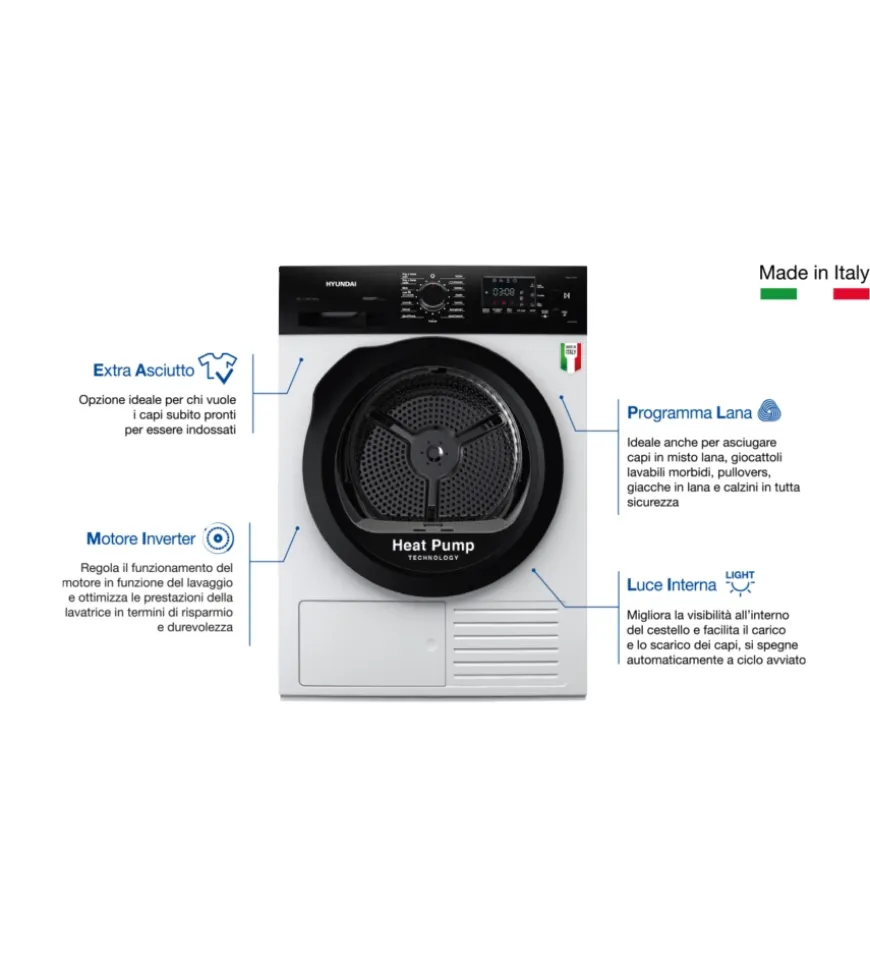 - 15 programmi: cotone, intensivo (Eco Dry), sintetico, rapido, camicie, asciugamani, jeans/colorati, piumino, sport/fitness, delicati, lenzuola, lana, misto, aria ambiente, aria calda