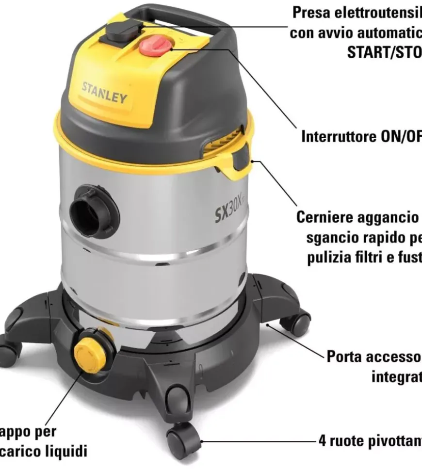 Aspiratore solidi liquidi elettrico Stanley “SXVC30XTDE” 1600W 30lt 36,5 l/s.