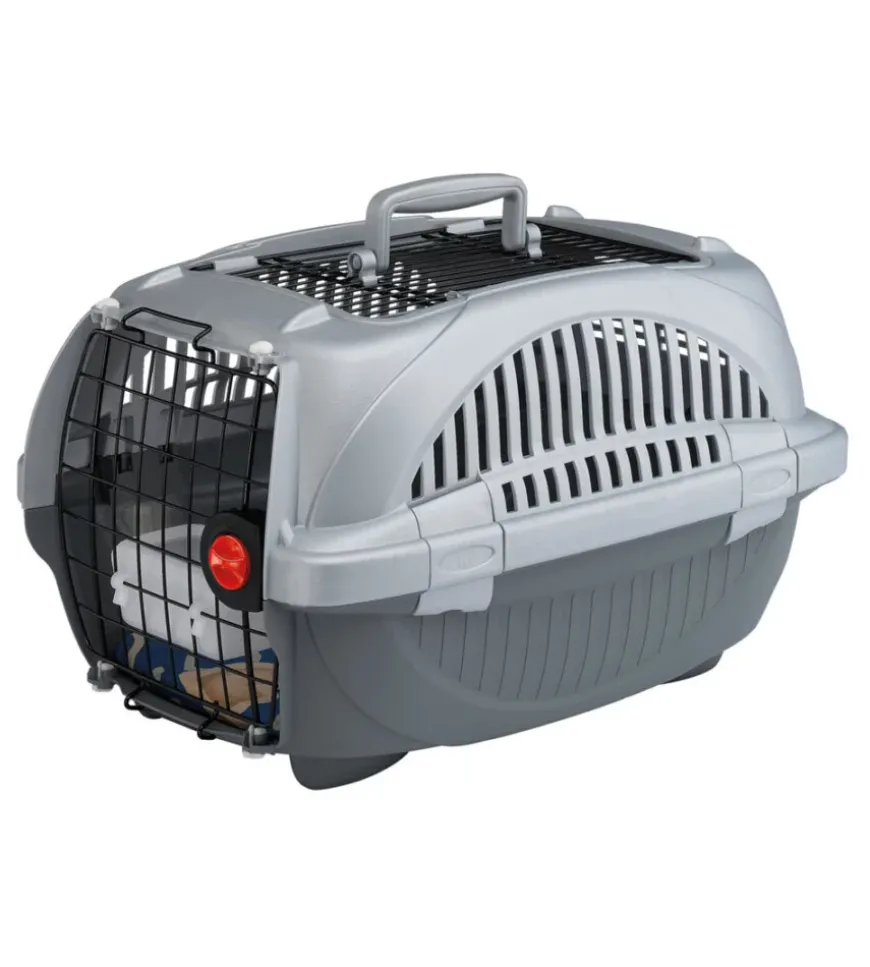 Trasportino in plastica per gatti e cani di piccola taglia con forma arrotondata e tettuccio apribile.