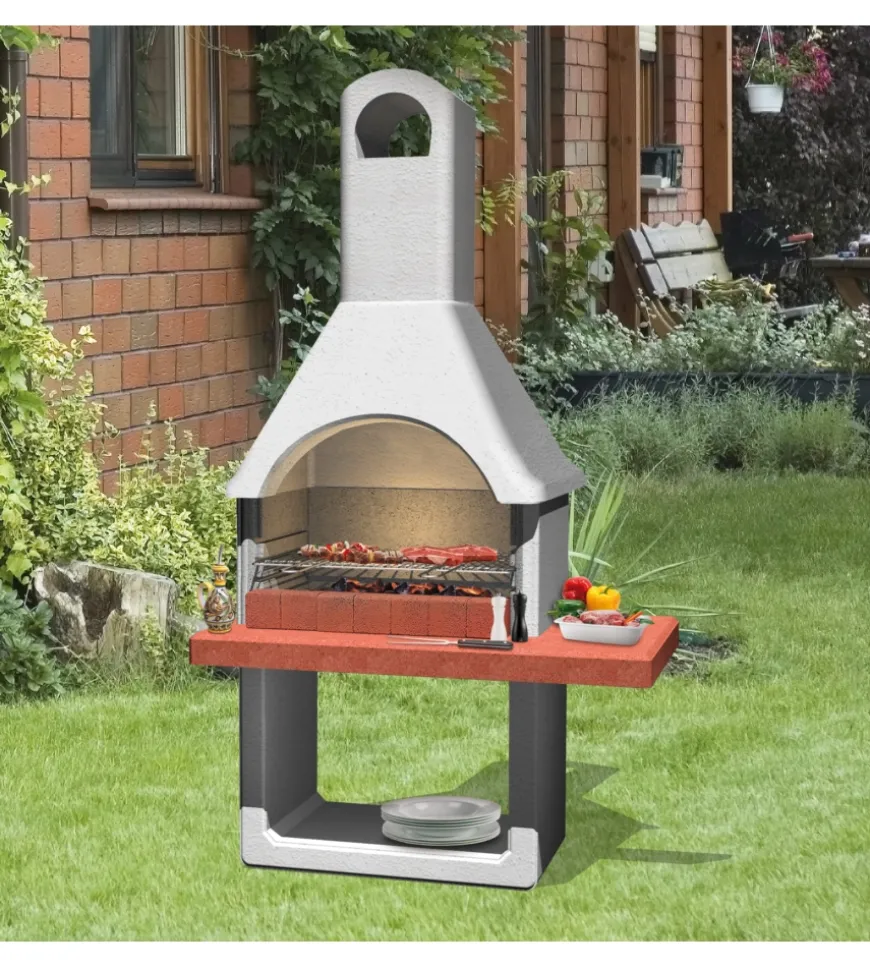 Barbecue a carbonella con griglia di dimensioni 67×40 cm. Ideale per pranzi e cene in compagnia, è in grado di preparare pietanze per ben 12 ospiti. Dispone di un piano di lavoro con una superficie di contatto laterale, color rosso. Dotato di griglia cromata, regolabile in 3 altezze. Il barbecue di Sarom Fuoco presenta un piano di lavoro (l. 114 cm) e Safe Grill precolorati nella mescola. È realizzato in cemento leggero color grigio. È facile da montare e può essere dipinto con il rivestimento al quarzo Sarom. Il barbecue a carbonella misura 88x58x197,3 cm e pesa 300 kg.