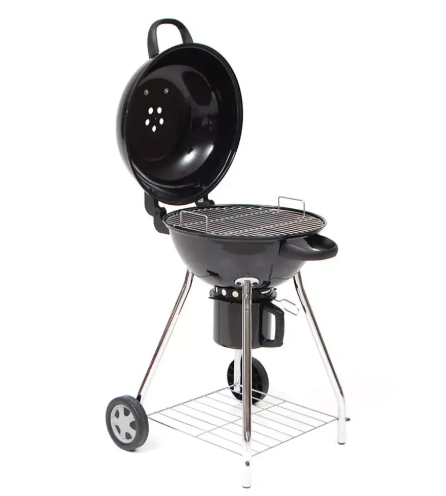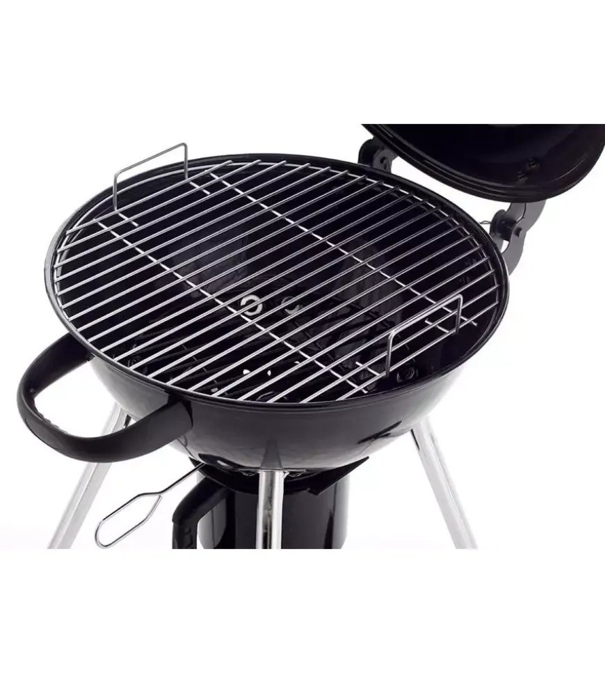 Il raccoglitore della cenere si estrae molto facilmente grazie alla maniglia integrata. Il coperchio di cottura è pieghevole e resta attaccato alla base.