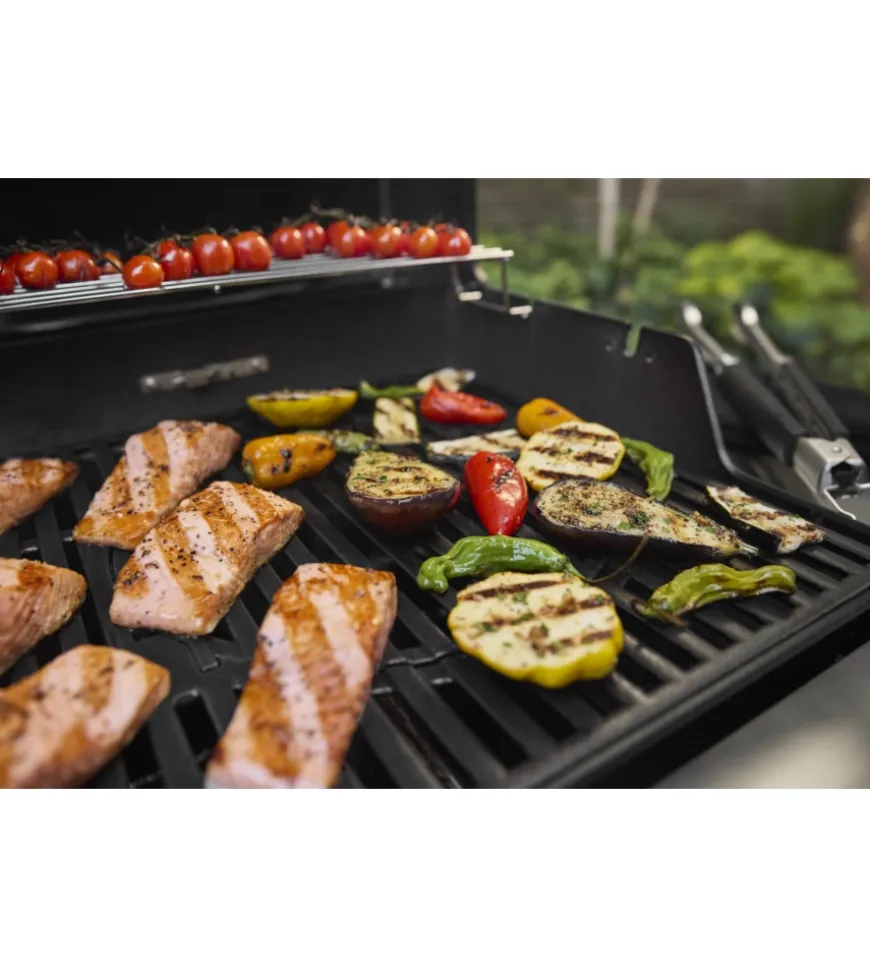 Monitora rapidamente la temperatura di cottura con il termometro digitale, visibile sia di giorno che di notte. Sfrutta al massimo lo spazio grazie ai ripiani laterali Weber Works, compatibili con accessori a scomparsa (venduti separatamente) e alle guide laterali per accessori ad aggancio rapido (anch’essi venduti separatamente). Le griglie di cottura Weber Crafted ti permettono di trasformare il barbecue in una cocotte, un supporto per pollame e molto altro, ed sono compatibili con gli accessori Gourmet BBQ System (venduti separatamente). Il design include un ripiano laterale fisso in acciaio inox e uno pieghevole, per ottimizzare lo spazio e tenere a portata di mano piatti, utensili e condimenti.