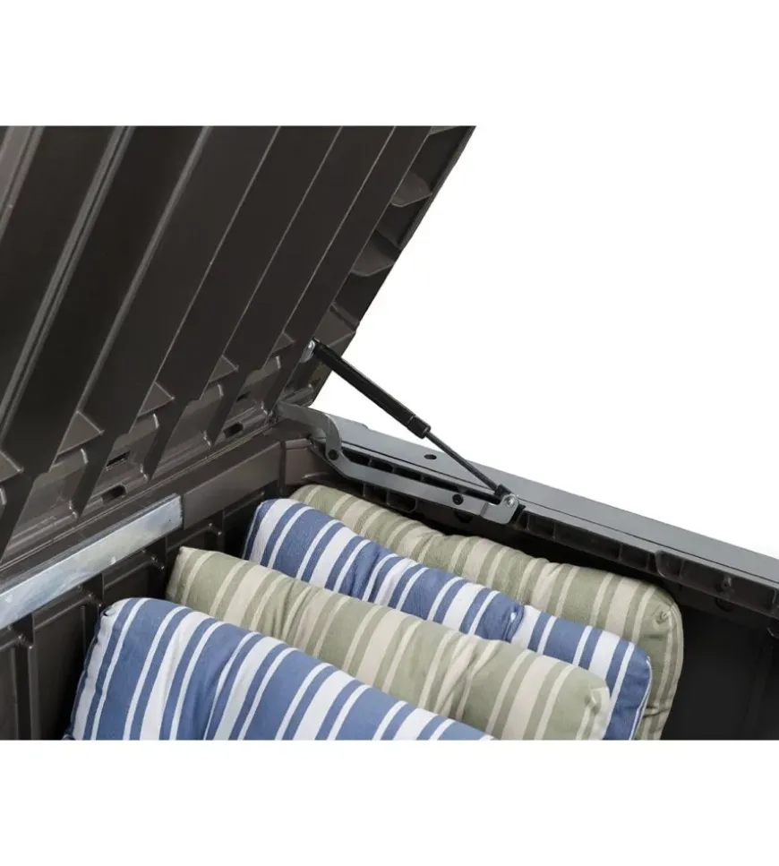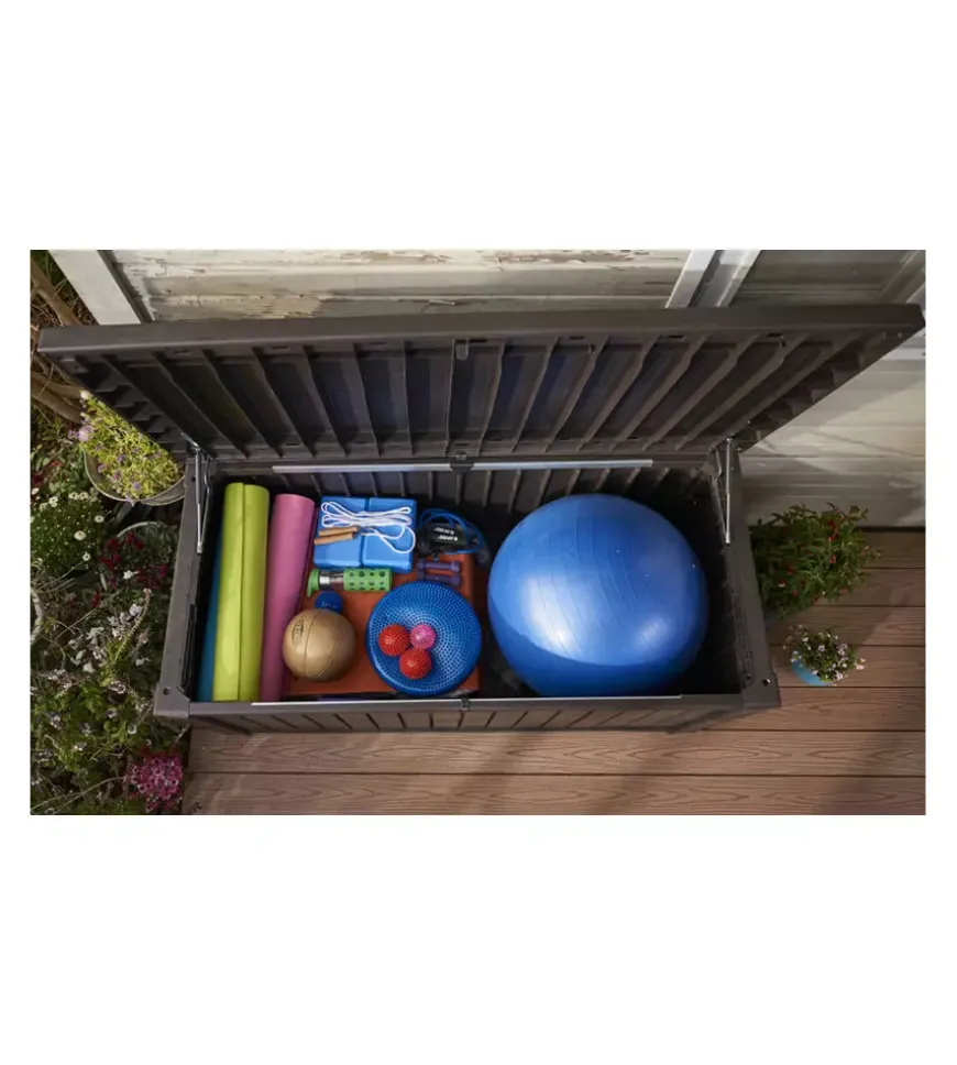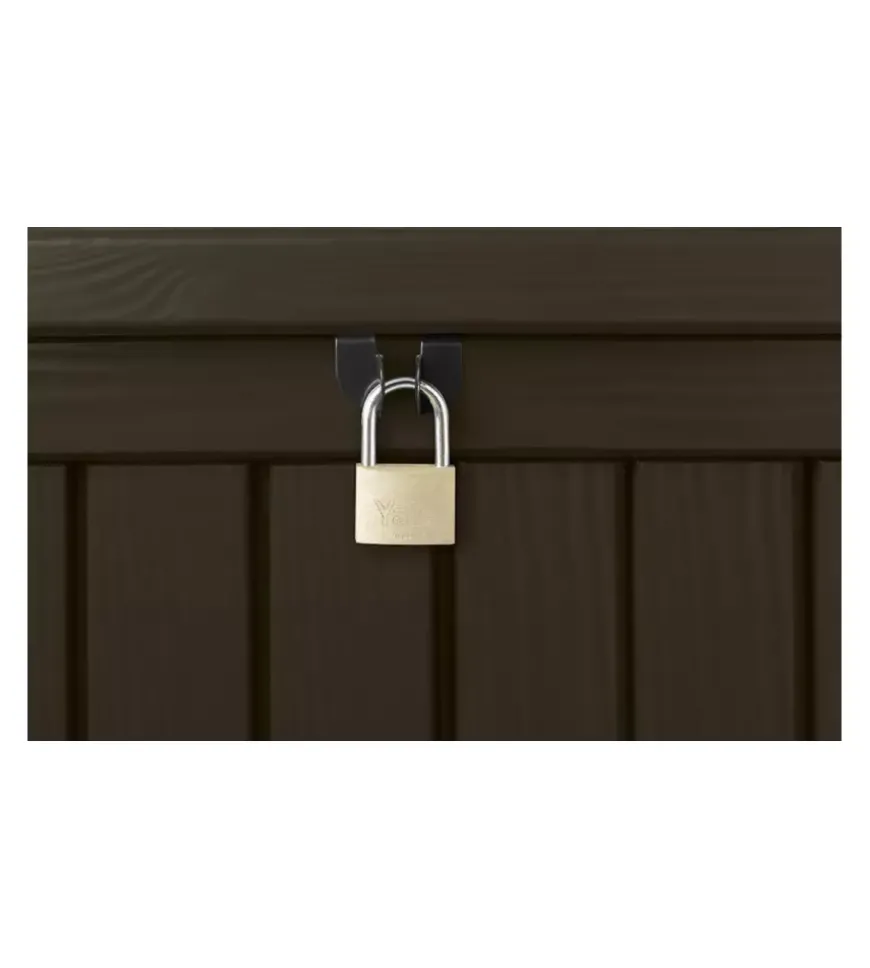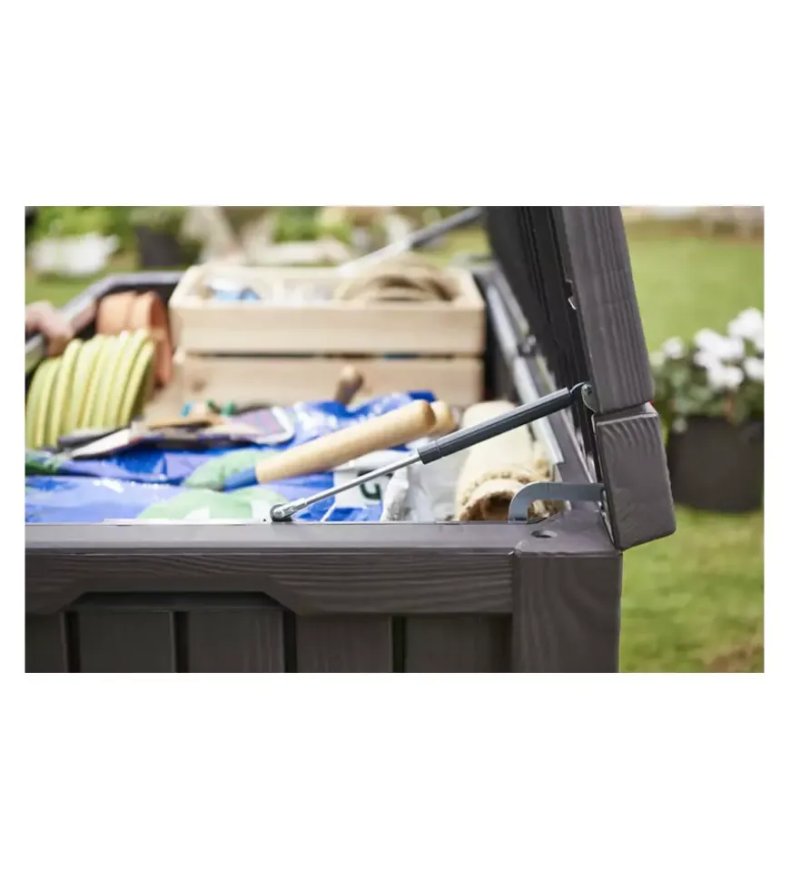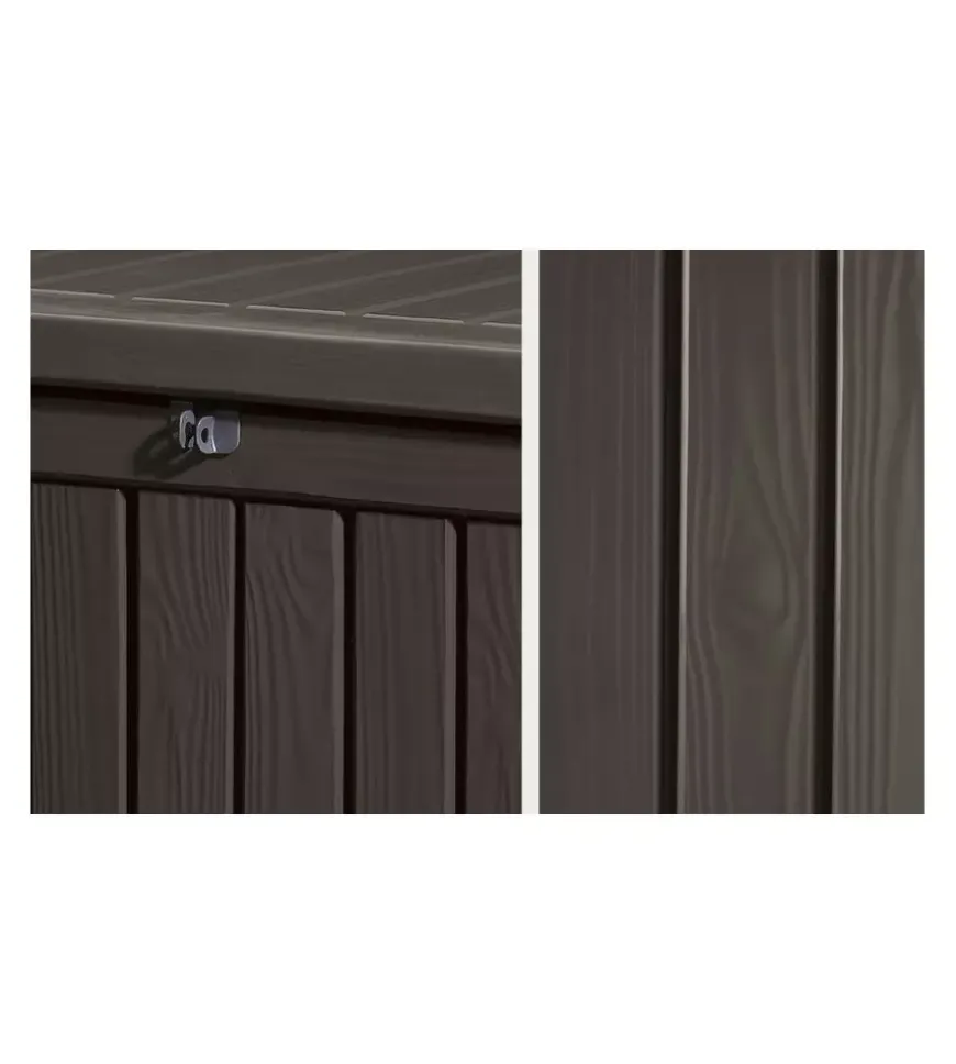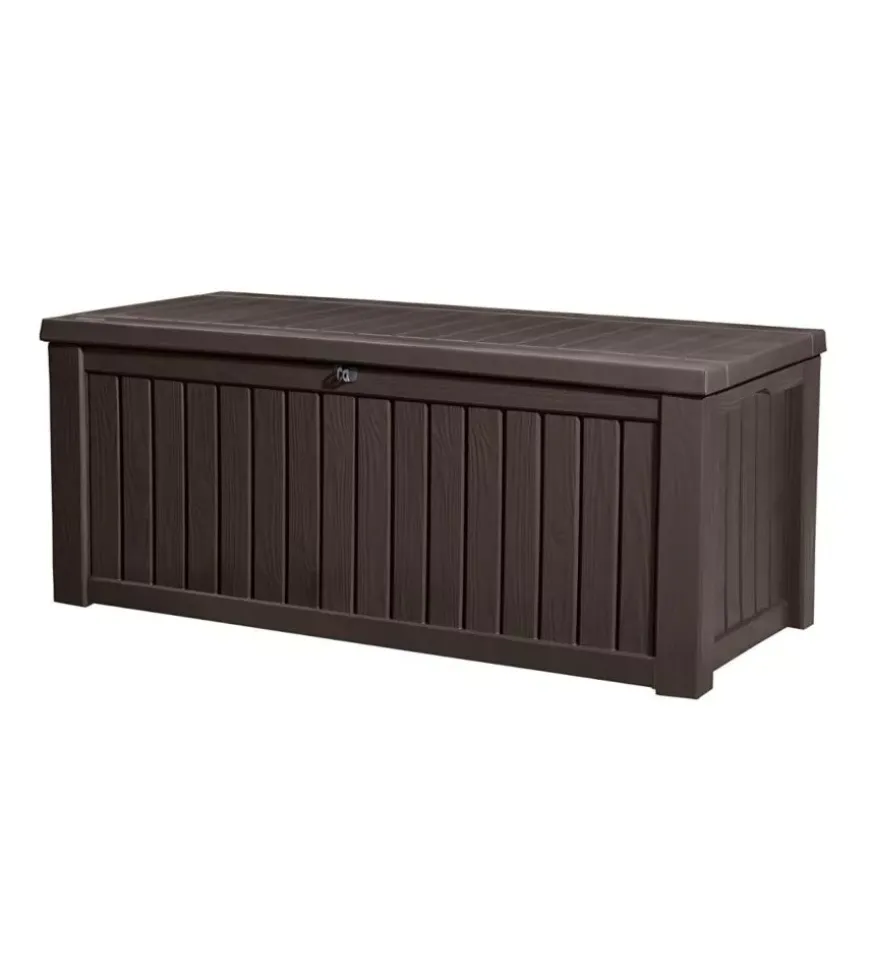 Baule Keter modello “ROCKWOOD” in resina con capacità di 570 litri, color marrone con finitura effetto legno. Baule resistente e multiuso ideale per il riponimento di oggetti da giardino, giocattoli, o cuscini. Può essere usato anche come seduta per i momenti di relax.