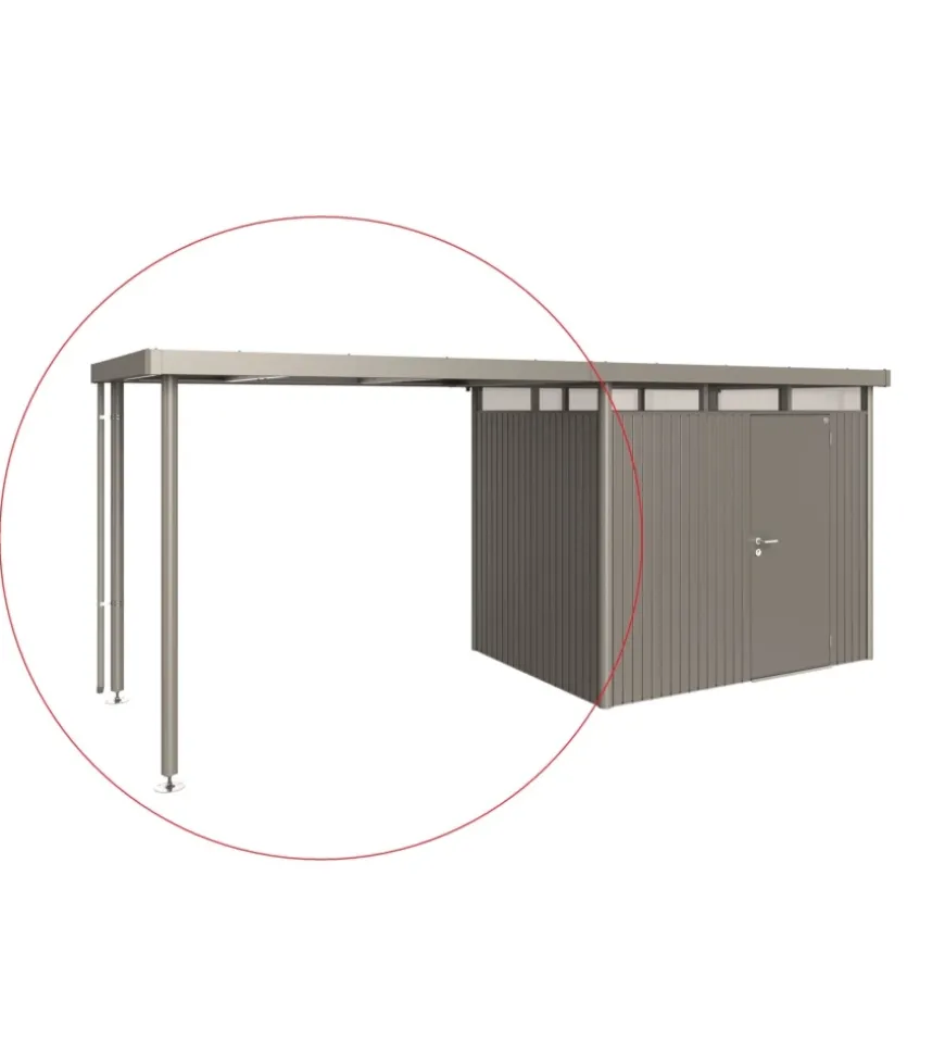 Il tetto laterale per la casetta Highline di Biohort è fissato su di essa sul lato con la grondaia antipioggia scegliendo se su uno o entrambi i lati, creando così uno spazio aperto ma coperto adiacente alla casetta.