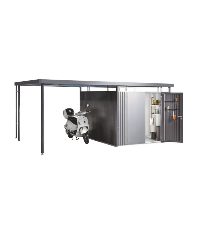 Il tetto laterale per la casetta Highline di Biohort è fissato su di essa sul lato con la grondaia antipioggia scegliendo se su uno o entrambi i lati, creando così uno spazio aperto ma coperto adiacente alla casetta.