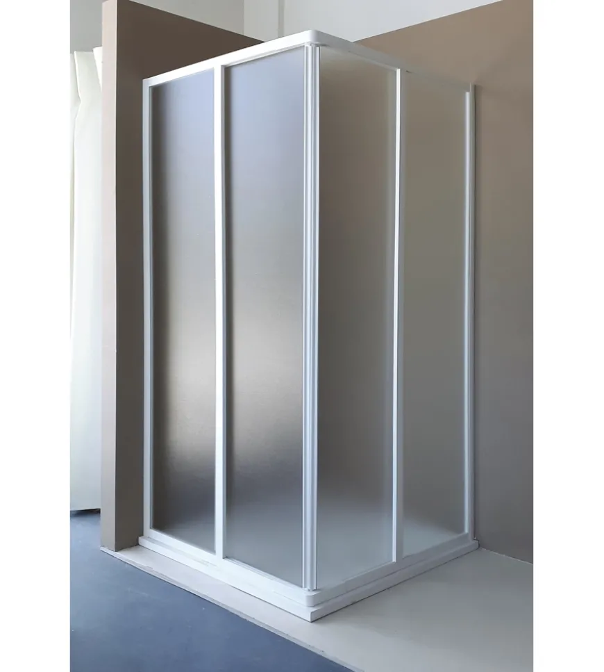 Cabina doccia con apertura ad ante scorrevoli, due fisse e due apribili.