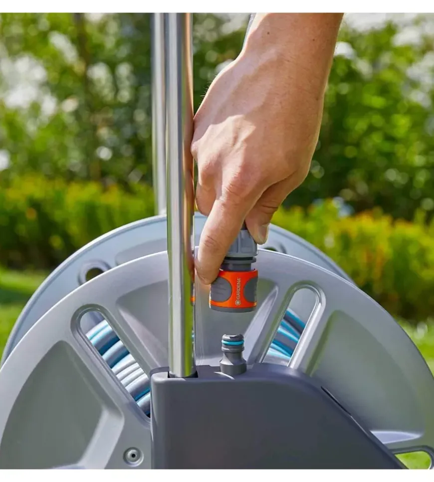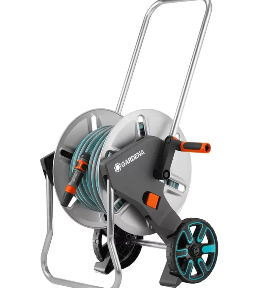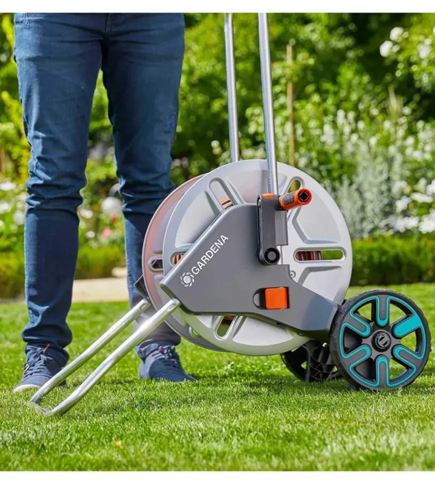 Il carrello avvolgitubo Gardena “CleverRoll M” in metallo è particolarmente robusto ed è in grado di sopportare anche le sollecitazioni più elevate. Il tubo flessibile può essere arrotolato in modo facile e veloce grazie all’ampia manovella in metallo con impugnatura ergonomica. Grazie del piede d’appoggio pieghevole il carrello mantiene una grande stabilità ed evita il ribaltamento. La sua forma speciale e le grandi ruote favoriscono un trasporto agevole e senza sforzo. Per risparmiare spazio, il piede e la maniglia di trasporto sono richiudibili. Il carrello avvolgitubo è pronto all’uso e include un tubo flessibile Classic da 25 m – 15 mm (5/8″), accessoriato con raccordi Original Gardena System e lancia a spruzzo. Capacità massima del carrello: 60 m 13 mm (1/2″), 50 m 15 mm (5/8″), 35 m 19 mm (3/4″).
