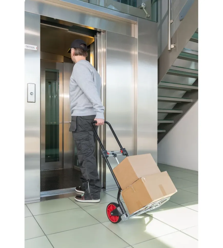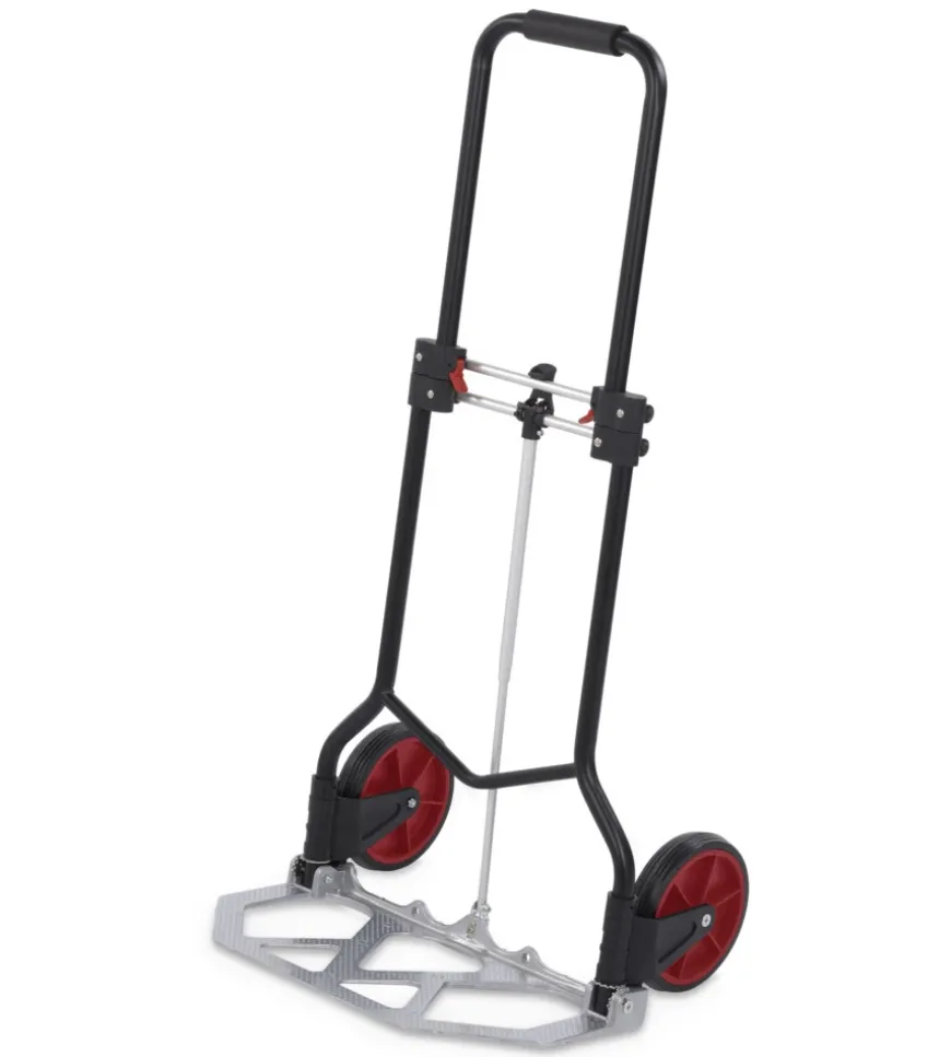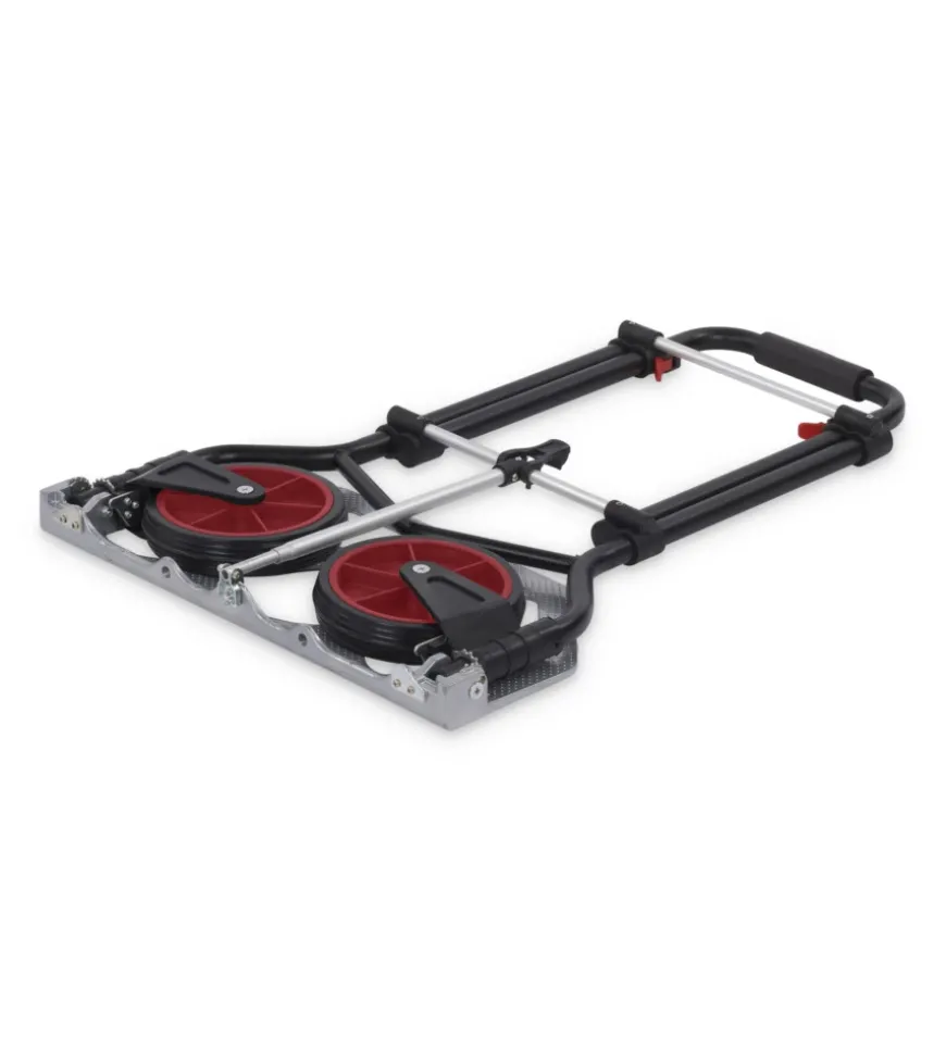 Carrello pieghevole con robuste ruote gommate ripiegabili, manico telescopico e struttura in alluminio.