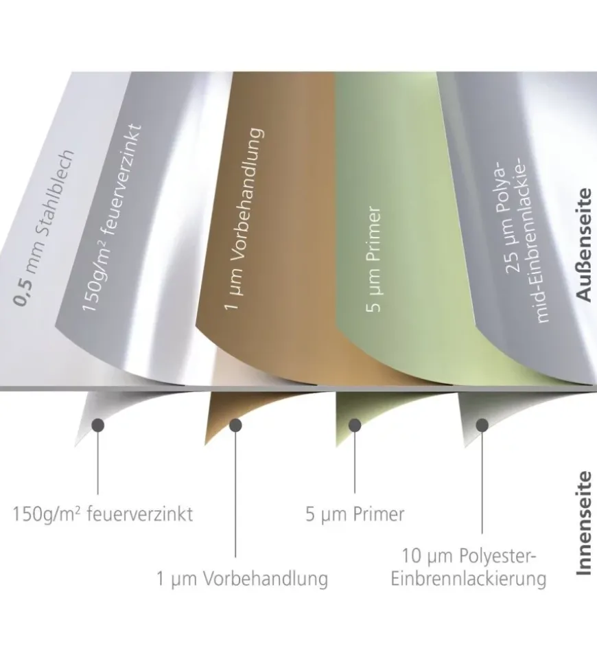 - Lamiera in acciaio zincato a caldo 0,5 mm e verniciatura a forno poliammidica
