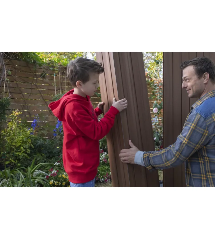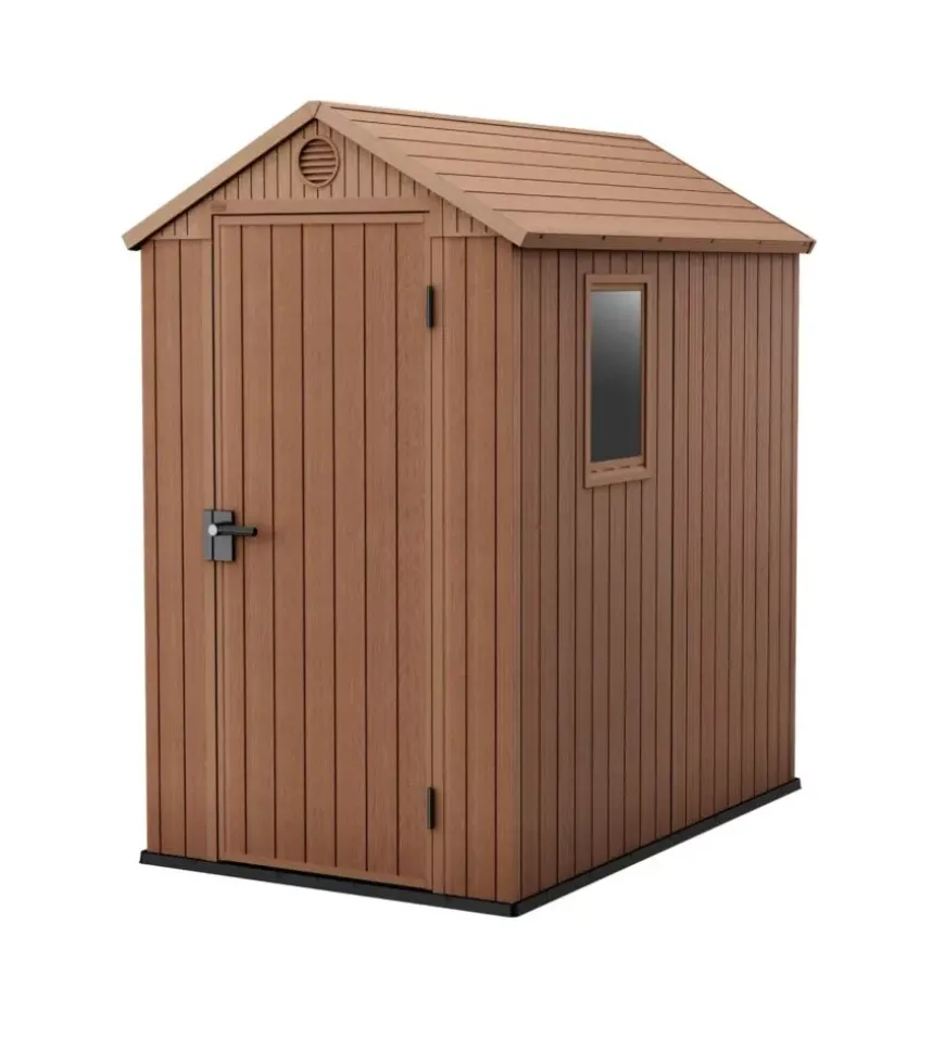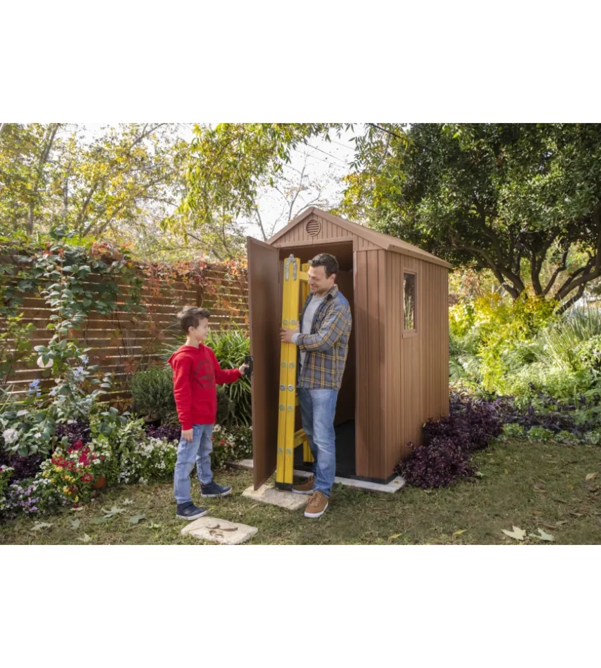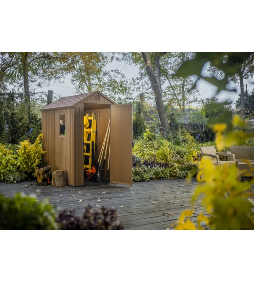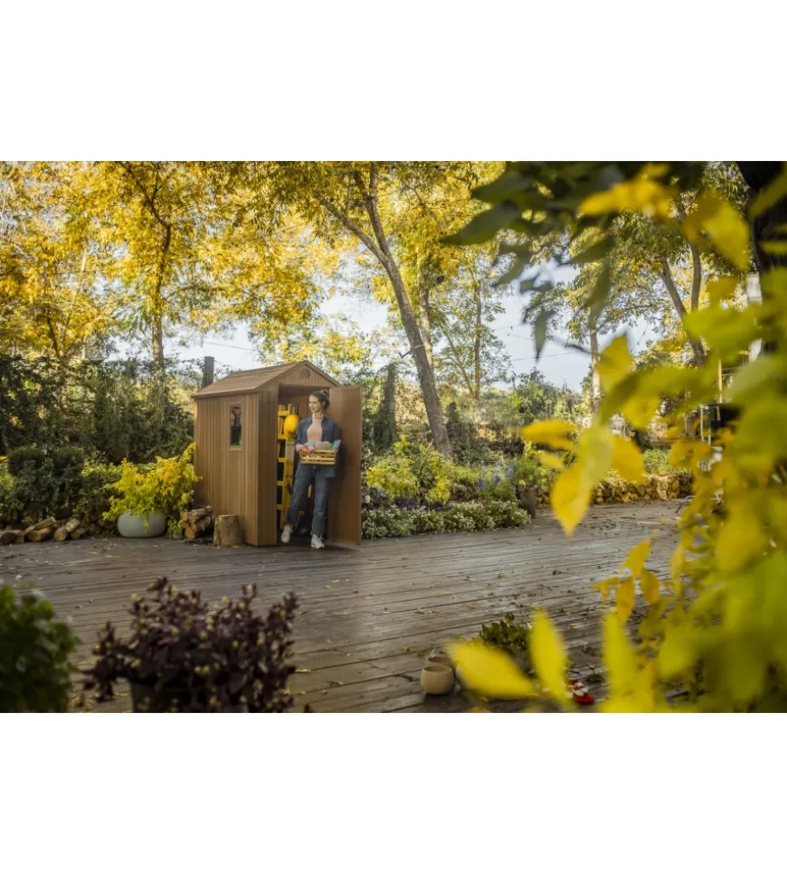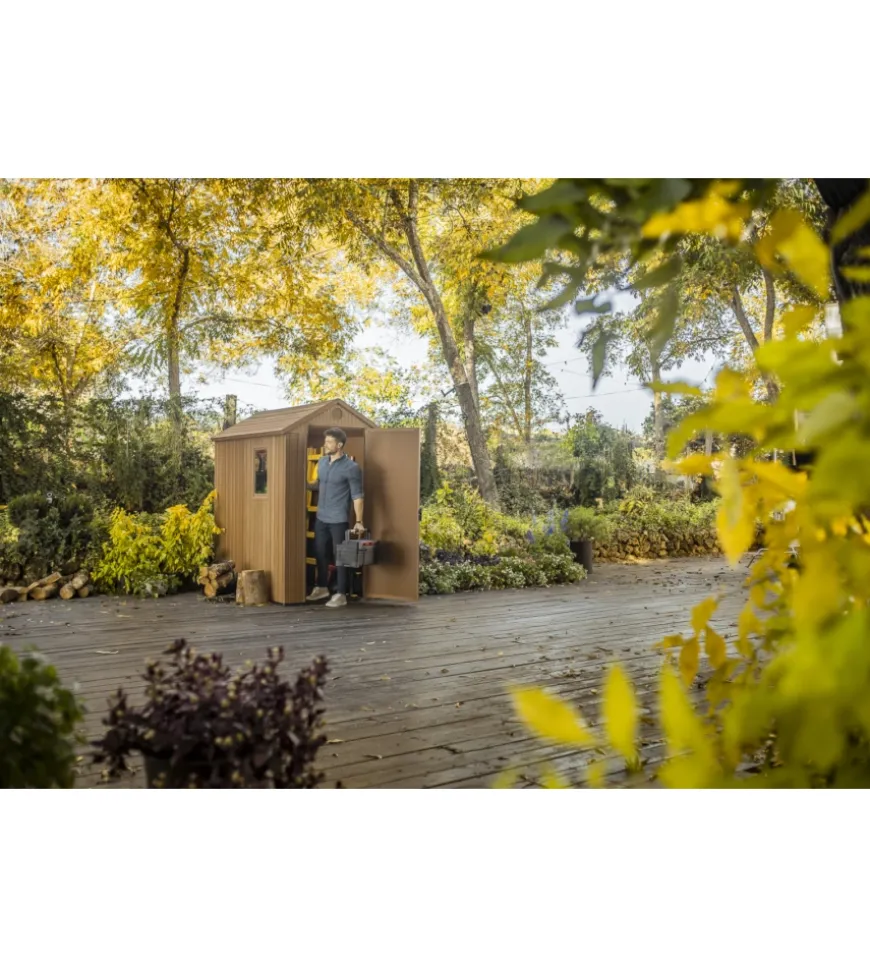 Le casette da giardino della linea Darwin sono realizzate in EVOTECH+, una resina resistente che riproduce la finitura del legno naturale, alla vista e al tatto. Grazie alla struttura con pareti a doppio strato e struttura interna rinforzata in metallo, la casetta da esterno è in grado di resistere alla pioggia e alla neve (fino a 75 kg/m2).