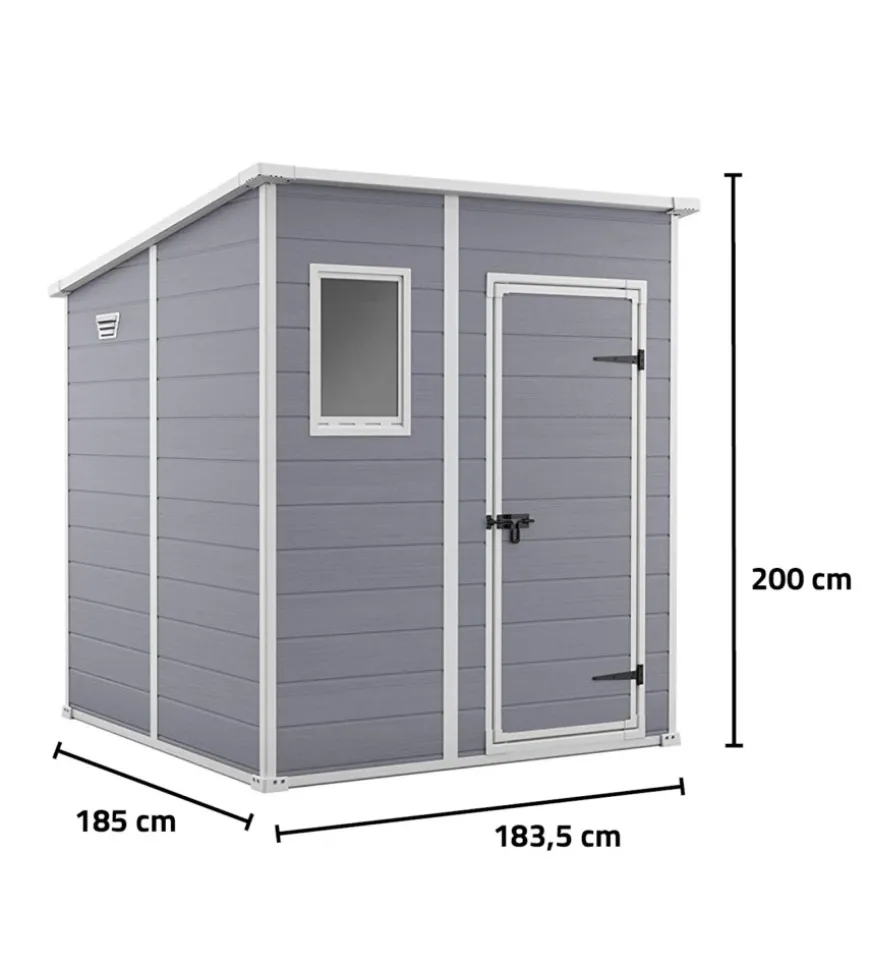 - Dimensioni esterne (incl. sporgenza tetto): 183,5x185x200 cm (L x P x A)