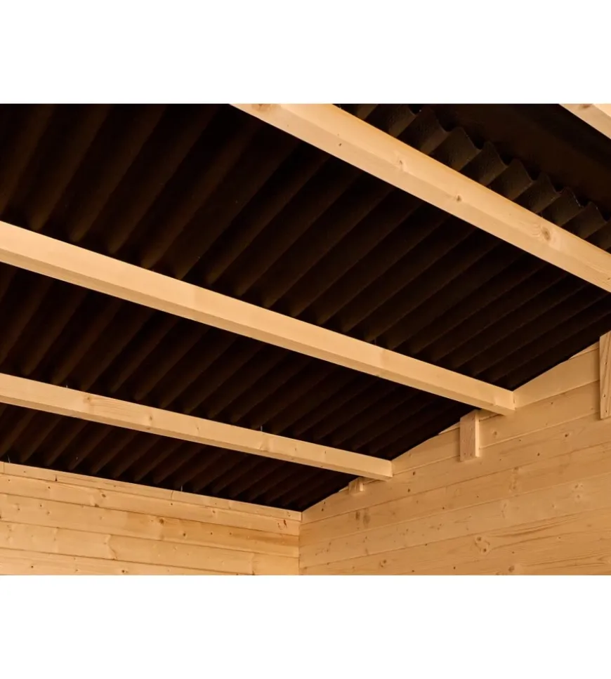 - Pareti: pannelli preassemblati di listelli piallati con maschio/femmina in abete spessore 16 mm fissati su telaio di sezione 25×25 mm