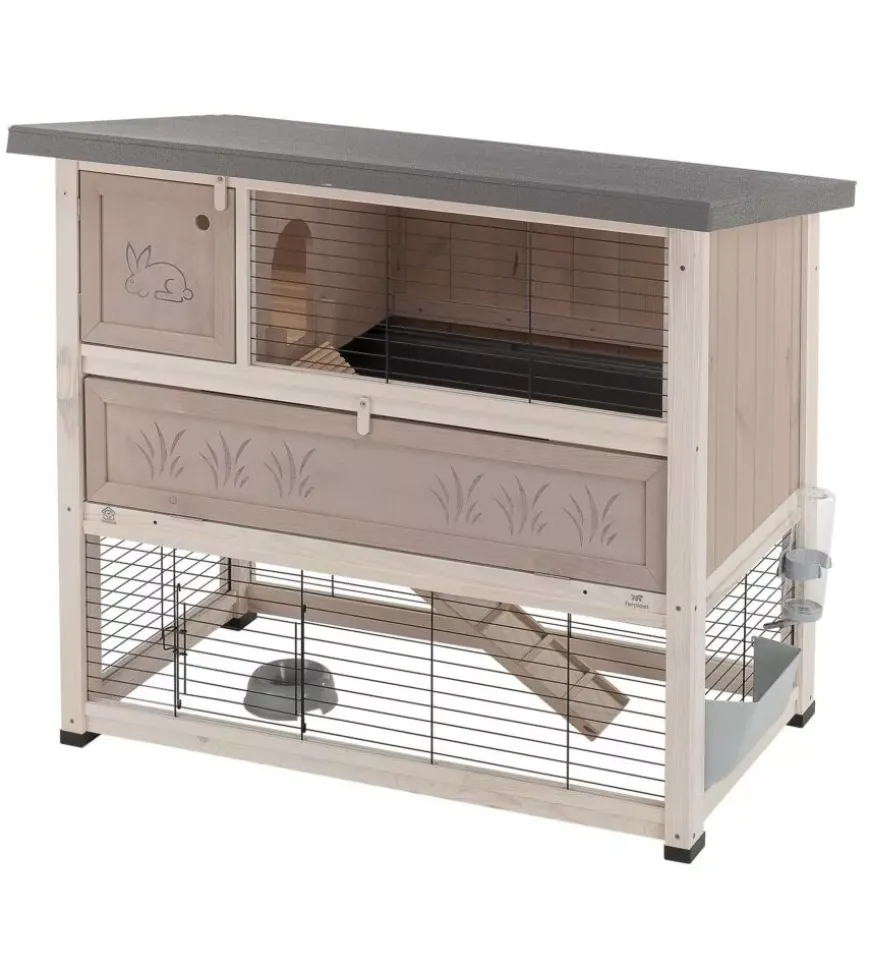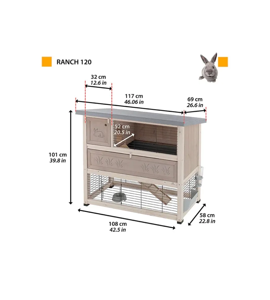La conigliera Ranch 120 è suddivisa su due piani dedicati alle diverse attività del piccolo ospite. Al piano terra troverete un recinto in metallo, provvisto di porta scorrevole con gancio di sicurezza, completamente accessoriato con mangiatoia per roditori in plastica, beverino, ciotola per il cibo e scaletta per accedere al piano superiore. Questa zona più tranquilla è fornita di capiente fondo in plastica ideale per contenere la lettiera e di rampa in legno che dà accesso ad una comoda casetta per il coniglio. La casetta ha uno sportello frontale apribile ed è dotata di chiusura di sicurezza.
