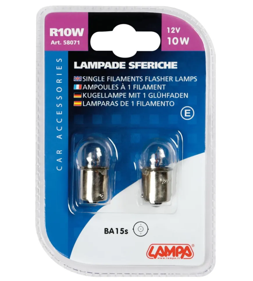12V Lampada sferica – R10W – 10W – BA15s – 2 pz – D/Blister.Per luci di posizione.Omolog: EVolt: 12VLampada: R10WWatt: 10WAttacco: BA15s.