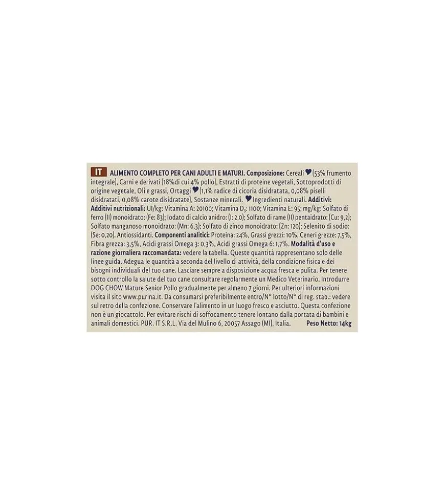 Crocchette per cani purina “dog chow mature senior” anziano di tutte le taglie con pollo 14 kg