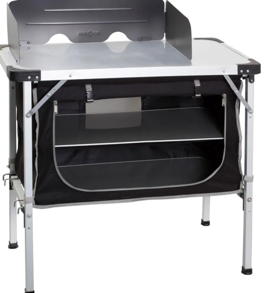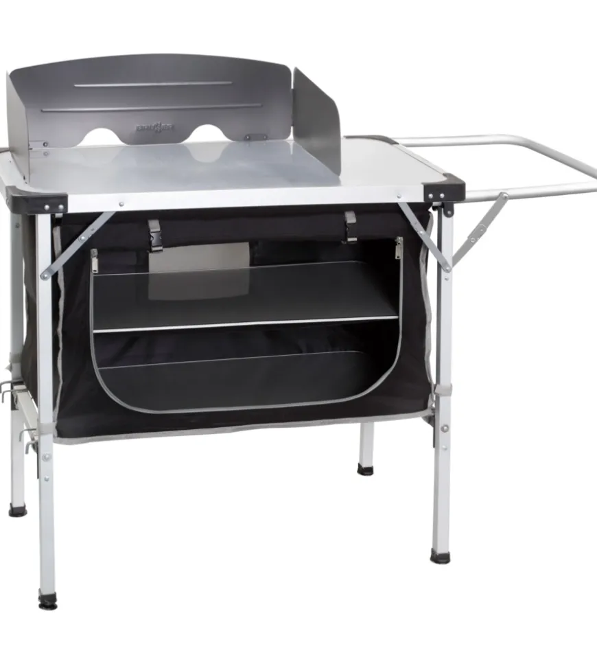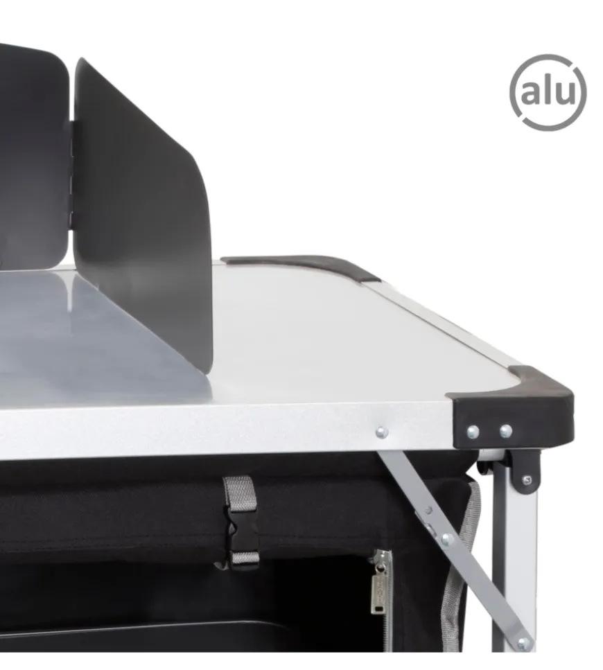 Mobiletto cucina con struttura in alluminio molto resistente ed un grande piano di lavoro in MDF con bordatura perimetrale in alluminio. Lintero mobiletto trova posto nella borsa di trasporto inclusa. Facile da montare e smontare. Lampio mobile con chiusura a cerniera offre spazio per riporre alimenti e accessori per la cucina. Include un supporto laterale pieghevole per un lavello collassabile.Caratteristiche: Telaio con gambe pieghevoli Pensile con base a griglia in acciaio Piedini regolabili in altezza Include un paravento ed un paraspruzzi in metallo