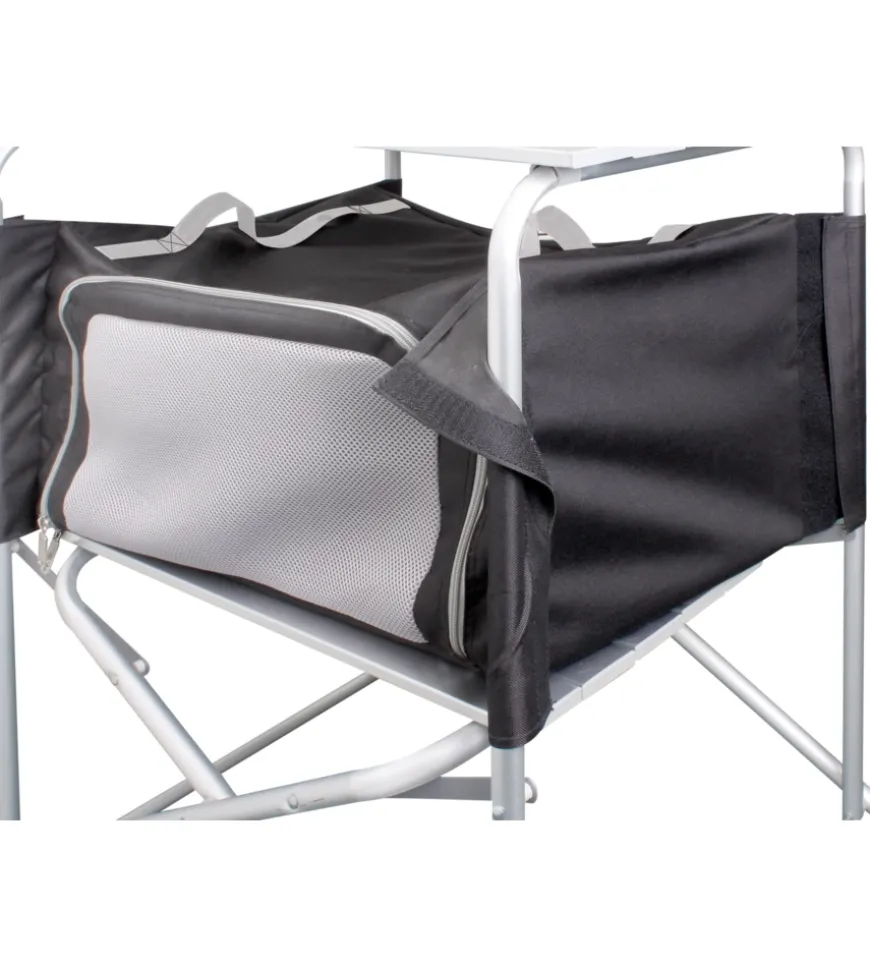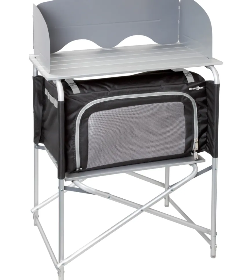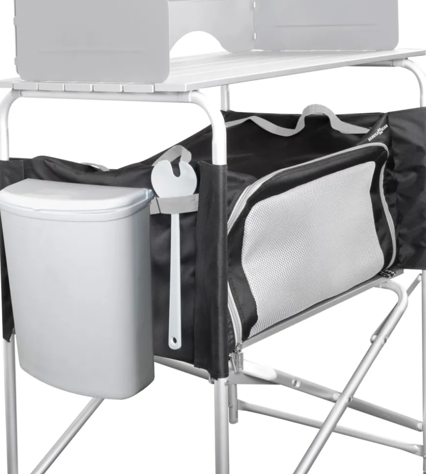 Mobiletto cucina da campeggio pieghevole con piano di lavoro arrotolabile, ripiano inferiore con armadio in tessuto rimovibile e utile paravento e paraspruzzi. Un piedino รจ regolabile in altezza. Veloce e facile da montare e smontare. Molto compatto quando chiuso e quindi facile da riporre. Completo di robusta borsa per il trasporto.Caratteristiche:ย Telaio in metallo, verniciato a polvereย Ripiano arrotolabile in alluminioย Tessuto in 100% poliestere spalmato
