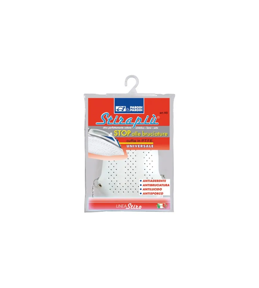 Cuffia da fissare sotto la piastra di qualsiasi ferro da stiro, si adatta a qualsiasi dimensione della piastra grazie al cordino incluso. Il materiale (P.T.F.E) con cui รจ stata brevettata permette di stirare perfettamente qualsiasi capo in cotone, lana, seta e anche sintetico senza bruciarsi, senza effetto lucido. Antiaderente e antisporco.