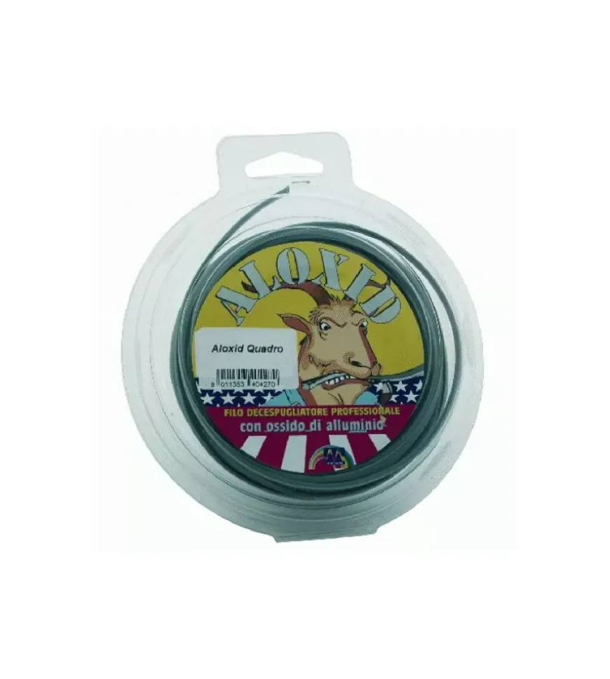 Sezione: quadra; Spessore del filo: 3,3 mm ; Lunghezza: 39 metri. ALOXID è il filo decespugliatore professionale con ossido di alluminio che conferisce altissima resistenza, grande flessibilità e lunga durata. Ideale per piante ed erbe più resistenti al taglio, grazie alla composizione del filo Aloxid sarà possibile estirpare anche piccole piante con gambo legnoso.