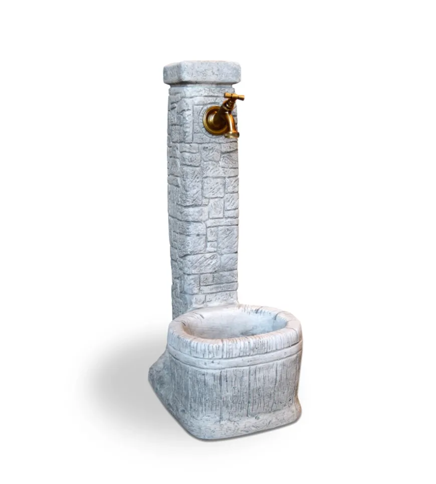 Fontana vedovella anticata “LUCCA” da esterno, di colore grigio. Il materiale resistente in cemento la rende ideale per il giardino. La fontanelle viene fornita compresa di tubo da 1/2″ nella colonna che permette il collegamento alla rete idrica.