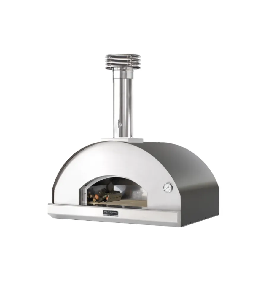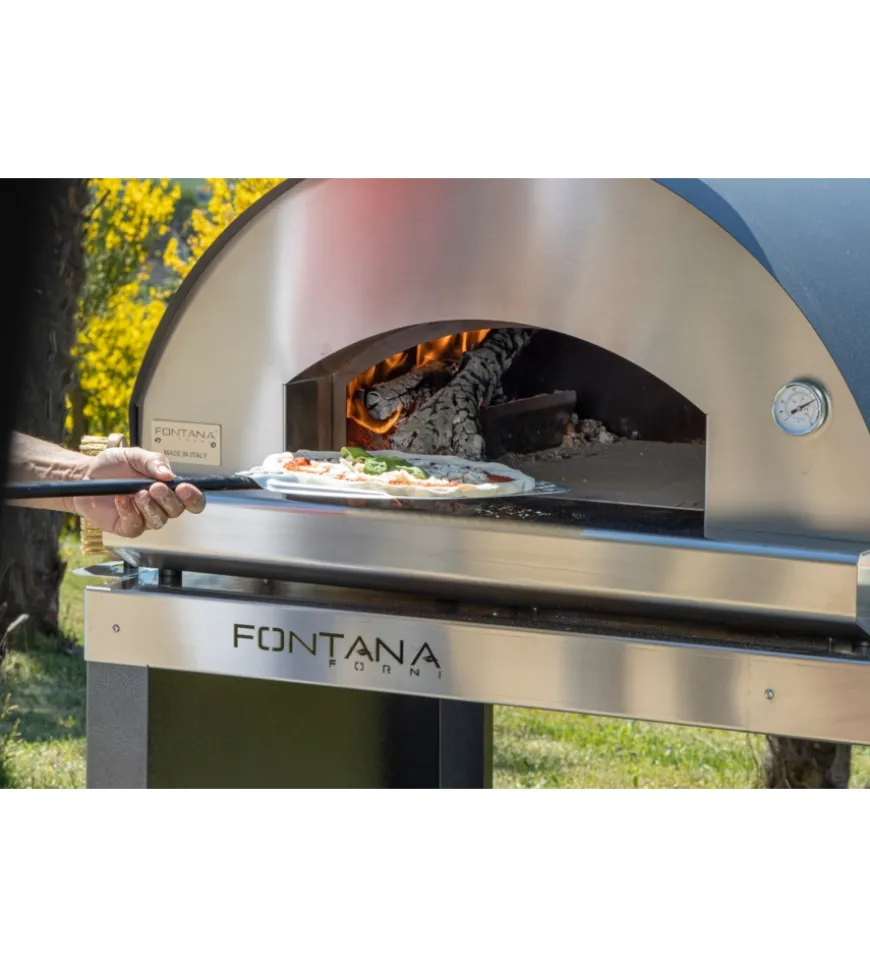 Forno per pizza con camera di cottura di dimensioni utili 60×80 cm. Dotato di piastra portalegna, utensile per ravivare la brace, canna fumaria e cappello, porta di chiusura della bocca di fuoco. Il piano di cottura è realizzato in chamotte refrattaria di alta qualità e certificata per usi alimentari. La struttura interna è in acciaio inossidabile mentre quella esterna è in acciaio elettrozincato trattato con vernici ad alta temperatura per la massima resistenza al calore, agli agenti atmosferici e alla ruggine. L’isolamento termico del forno è realizzato in lana di roccia naturale e permette di contenere la temperatura in modo più efficace ed evitare un eccessivo riscaldamento della struttura esterna.