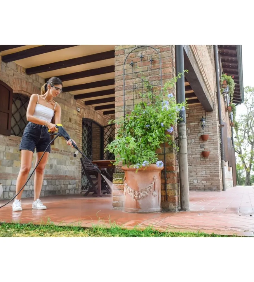 - 3 diverse modalità di utilizzo selezionabili con l’apposito interruttore rotante: lavaggio SOFT per legno, biciclette e mobili da giardino; lavaggio MEDIUM per auto, moto e caravan; lavaggio HARD per asfalto, pietra e muri di mattoni