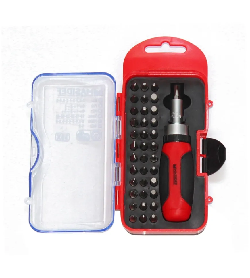 - Kit 38 pezzi: 37 insert e 1 giravite porta inserti a cricchetto con impugnatura ergonoica in bimateriale