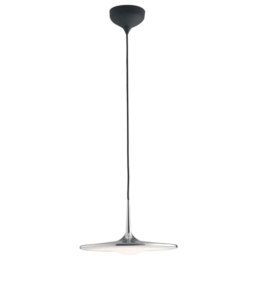 Lampada Led a sospensione, con struttura in metallo cromato e filo in tessuto nero.