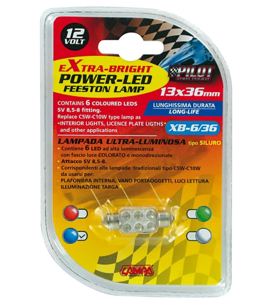 Be the first to review “Lampada siluro 6 led 12v – 13×35 mm – sv8,5-8 – 1 pz – d/blister – blu 58427” Annulla risposta