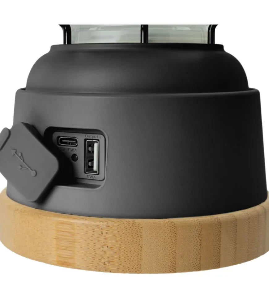Elegante lanterna LED con resistente struttura realizzata in metallo verniciato, base in bambù e schermo traslucente in materiale plastico. Dotata di interruttore dimmer ON-OFF con 2 modalità di illuminazione: una a luce calda ed una a luce bianca. La batteria integrata agli ioni di litio può essere ricaricata con il cavo USB in dotazione. Utilizzabile in molteplici applicazioni.