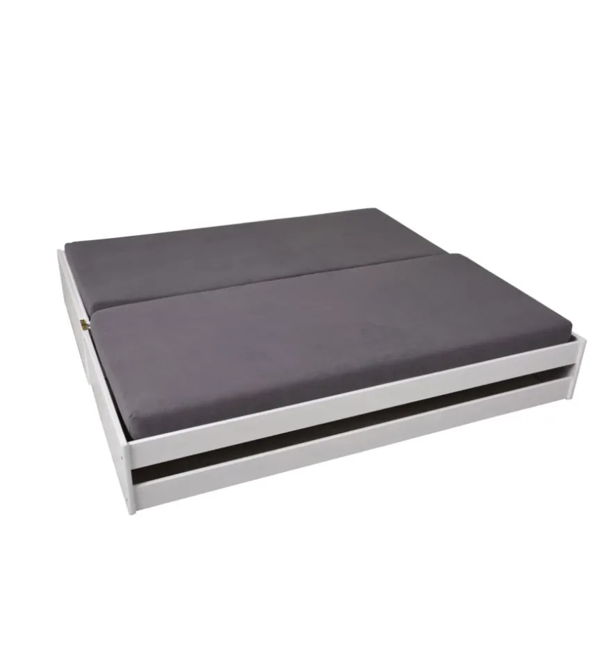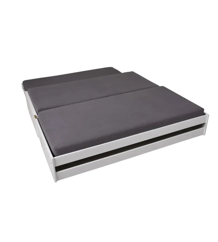 Il letto singolo trasformabile in 3 letti è la soluzione ideale per chi ha bisogno di ospitare più persone senza rinunciare a praticità e stile. Realizzato in pino massello verniciato bianco, che lascia trasparire le naturali venature del legno, questo letto solido e resistente può trasformarsi facilmente in tre posti letto: un letto estraibile a cassetto e un altro che si apre a ribalta, creando un letto matrimoniale più un singolo. Le reti da 90×200 cm sono incluse, garantendo comodità e supporto.