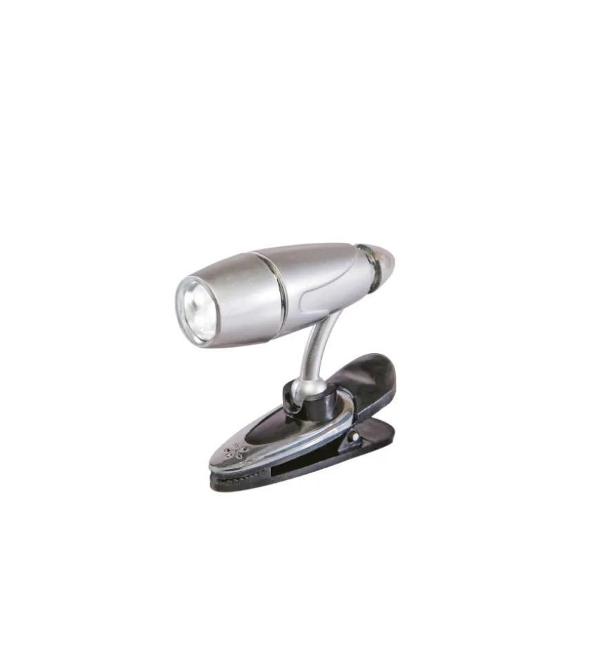 Luce led da lettura con aggancio a pinza e braccio regolabile a 360°. Dotata di 3 LED e interruttore ON / OFF. Funziona con 3 batterie AG13 (incluse nella confezione).Colore: argento.Emette una luminosa luce bianca.Grazie alla pratica clip universale e al braccio regolabile a 360° è adatta ad essere applicata ovunque: libri, riviste, giacche, cintura di sicurezza, occhiali, visiere ecc. Consumi bassissimi e lunga durata grazie alla tecnologia led. PLUS PRODOTTO: # Batterie incluse# Adatta per essere applicata ovunque# Basso consumo e lunga durata