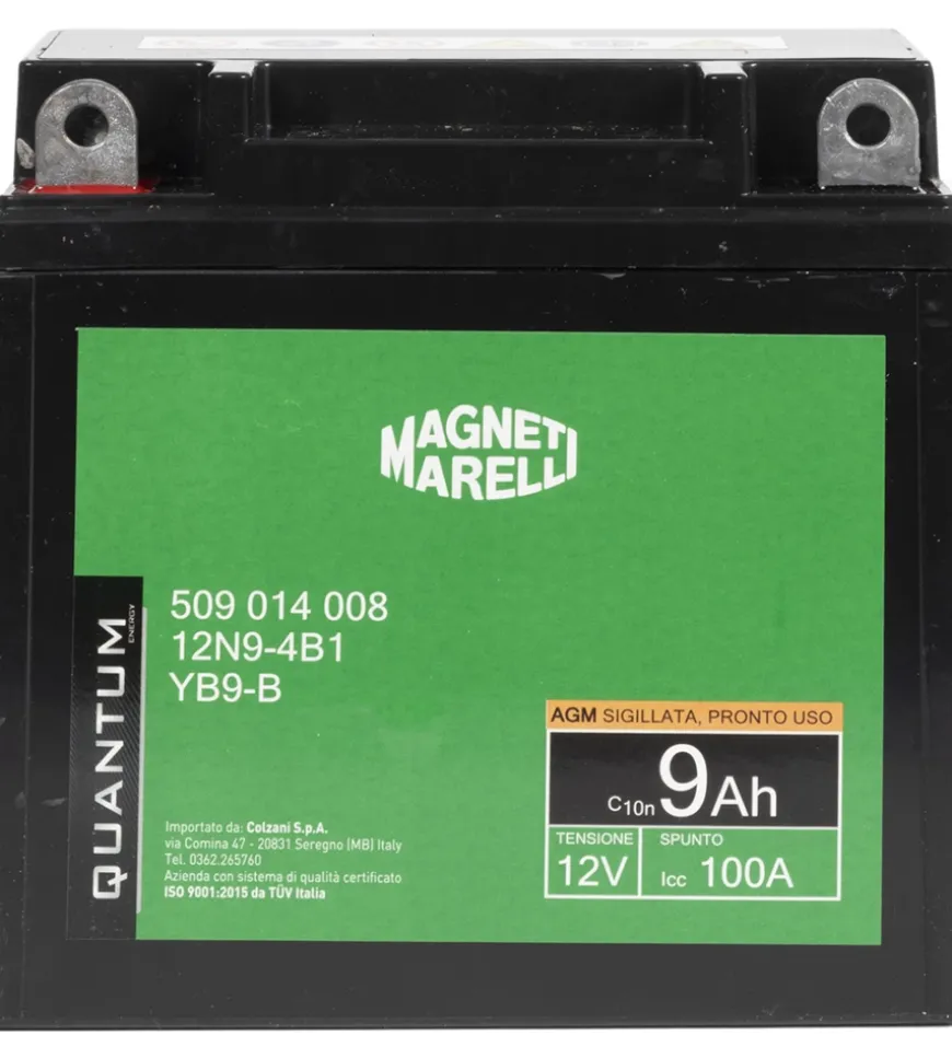 Magneti Marelli Quantum Energy propone la batteria per moto e scooter 9AH 12V 100A con polo positivo sinistro.La batteria è caratterizzata da tecnologia AGM (Absorbent Glass Mat), con piombo-acido, che assorbe tutto l’acido contenuto nella batteria fornendo un’elevata stabilità ciclica. Ciò consente alle batterie di caricarsi e ricaricarsi ripetutamente senza compromettere le performances.La batteria Quantum Energy è fornita di codice JIS: 12N9-4B1 YB9-B e codice ETN: 509 014 008.Pronta all’uso, la batteria Quantum risulta di facile installazione e presenta le seguenti misure: 137*76*134 mm.