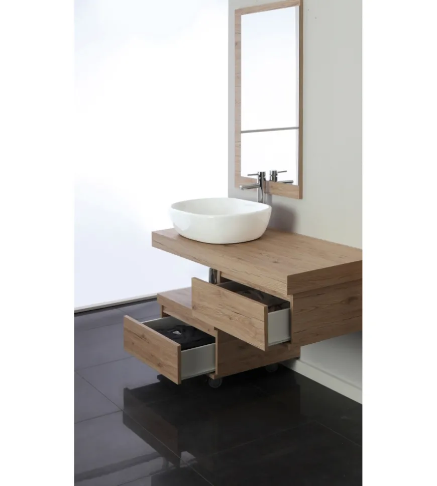 Composizione bagno sospesa colore rovere completa di top spessore 8 cm e due cassettiere posizionabili con ruote o sospese.