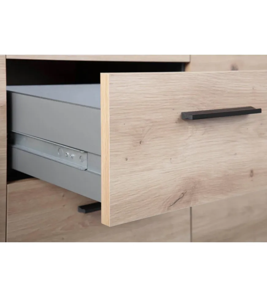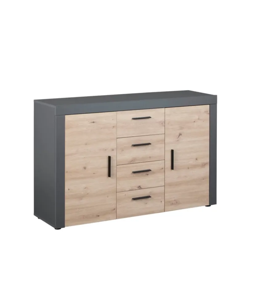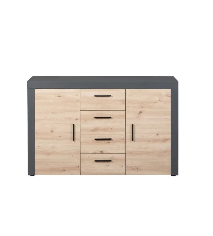 Mobile buffet in stile industriale, con struttura grigia, ante rifinite effetto quercia e maniglie in metallo.
