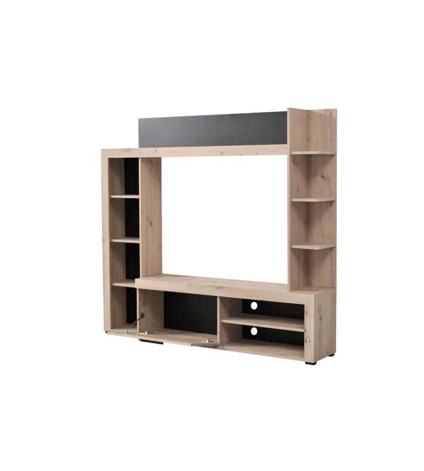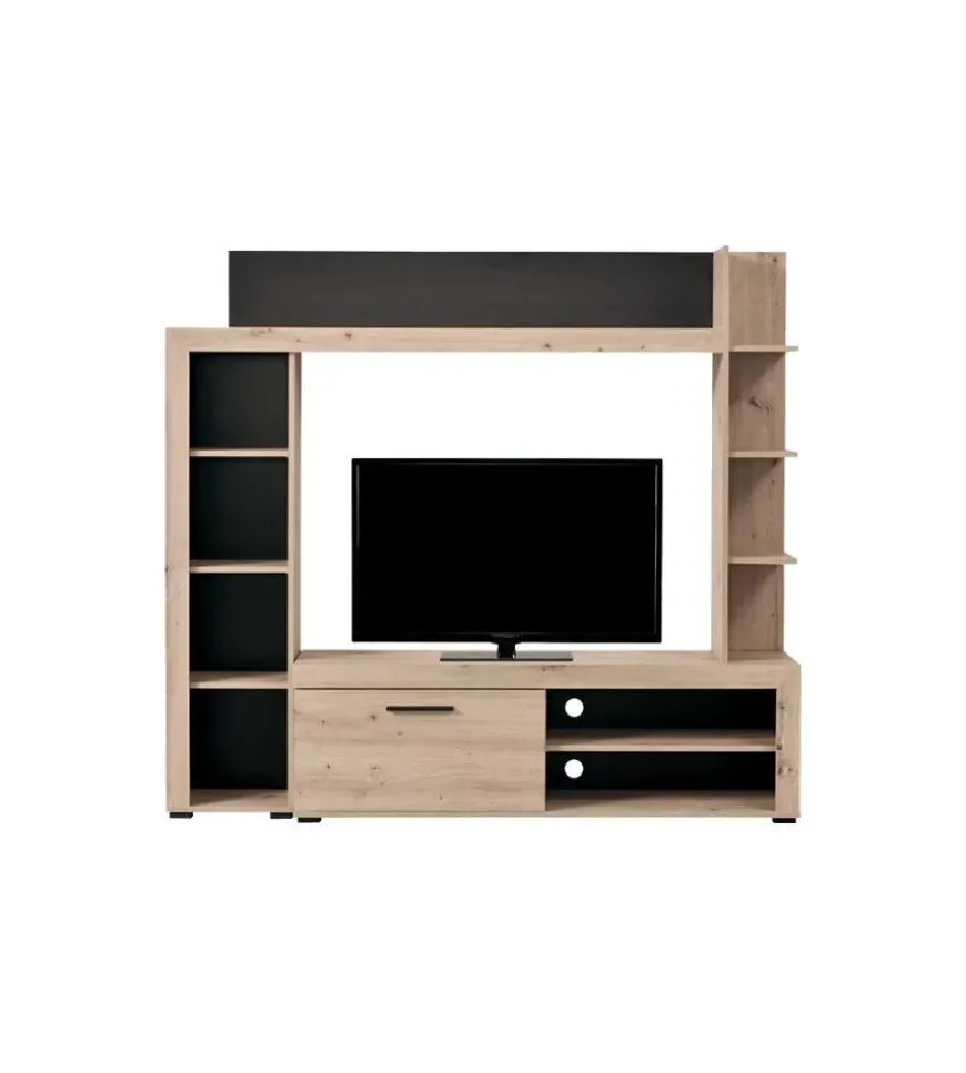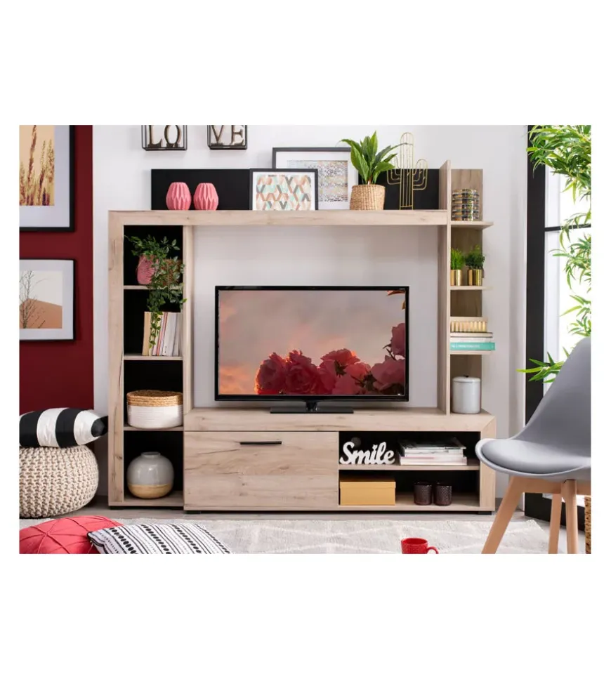 La parete da soggiorno “Venezia” è un mobile tv dal design moderno con un tocco classico, ideale per ottimizzare lo spazio e valorizzare l’ambiente. La struttura in legno effetto quercia con venature a vista, combinata con i dettagli neri, crea un elegante contrasto, perfetto per abbinarsi a vari stili di arredo. Il mobile offre ampio spazio di archiviazione con ripiani regolabili e una grande anta a ribalta, oltre a un pratico supporto per il televisore, che può ospitare anche modelli di grandi dimensioni.