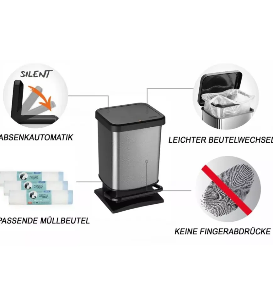 La pattumiera “Paso” combina un sistema di smaltimento dei rifiuti elegante con una funzionalità assoluta. Dispone di una forma salvaspazio e un materiale robusto, il cestino per rifiuti è la scelta più utile per la casa. È estremamente facile da usare grazie al meccanismo a pedale, azionabile da tre lati. La pattumiera “Paso” rappresenta un aiuto perfetto in officina, nella stanza dei bambini, in ufficio, in cucina, in bagno e altro ancora. È facile da pulire e, grazie alla plastica di alta qualità, non lascia impronte o ammaccature e non arrugginisce.