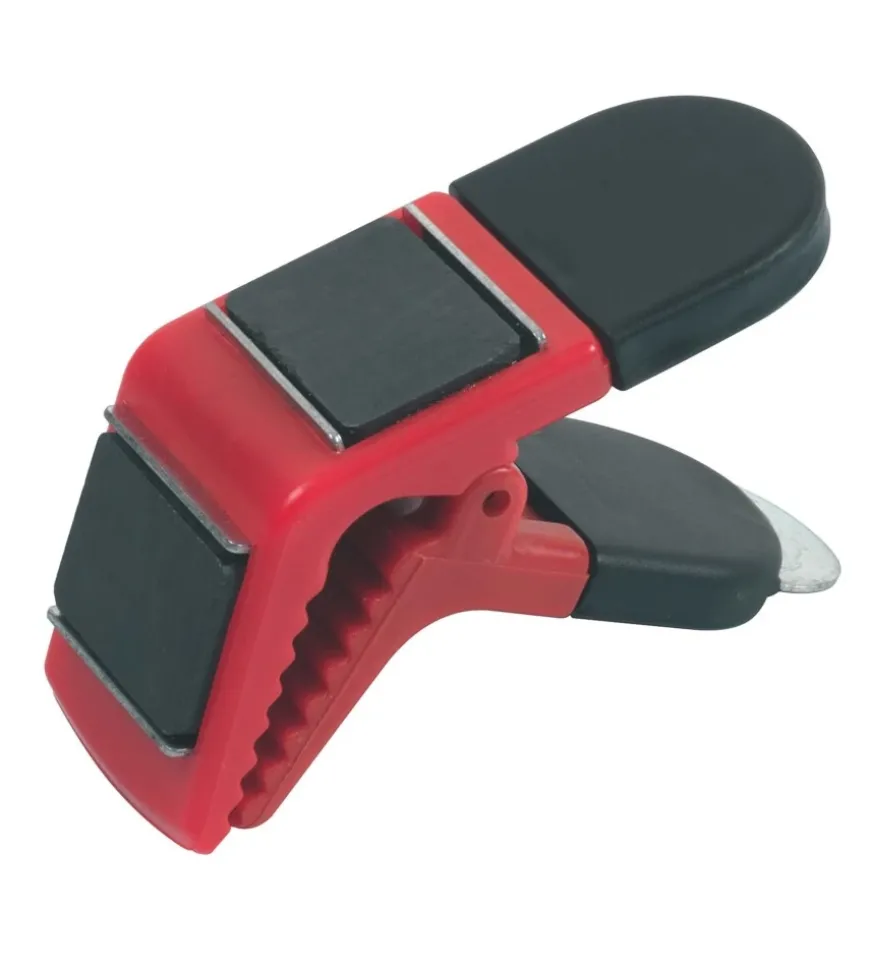 PRPP/B – Pinza portapennello in polietilene con punte di gomma. Dotata di 2 piastre a calamita. Asse e molla in acciaio inossidabile. Staffa metallica pratica, per aprire i barattoli di vernice.