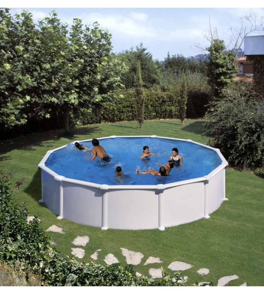 - Piscina rotonda con parete in acciaio e decorazione in colore bianco