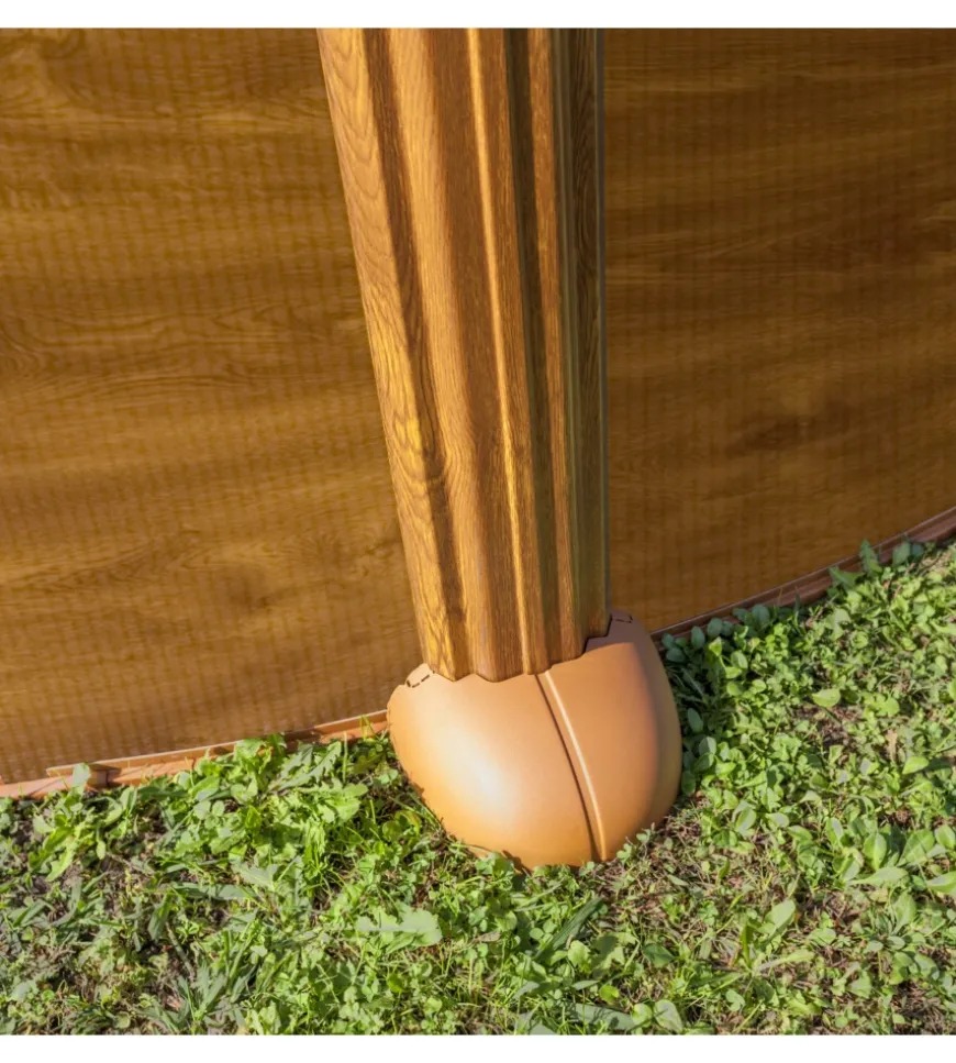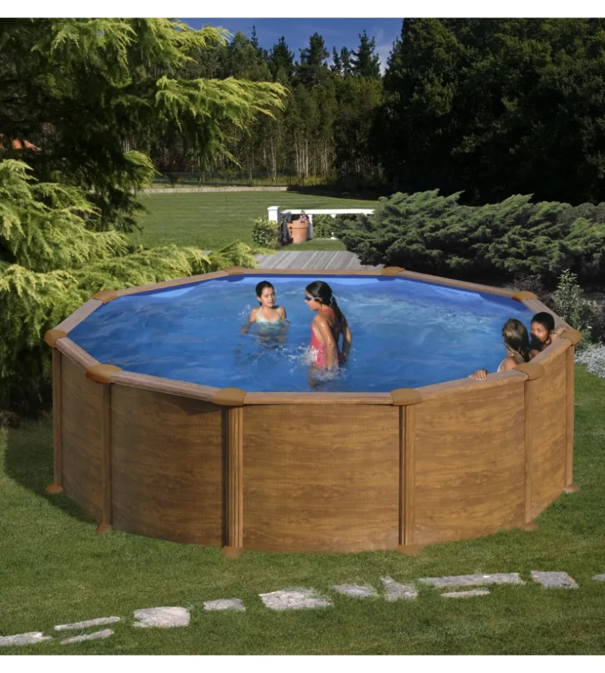 - Piscina rotonda con parete in acciaio e decorazione in legno