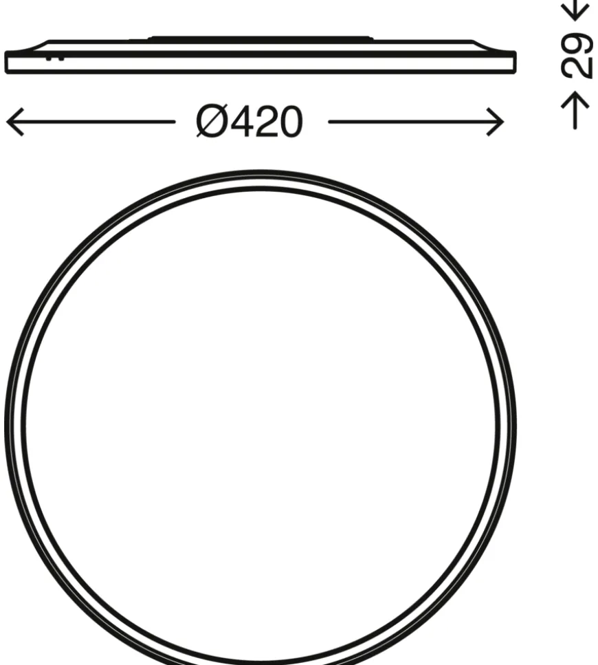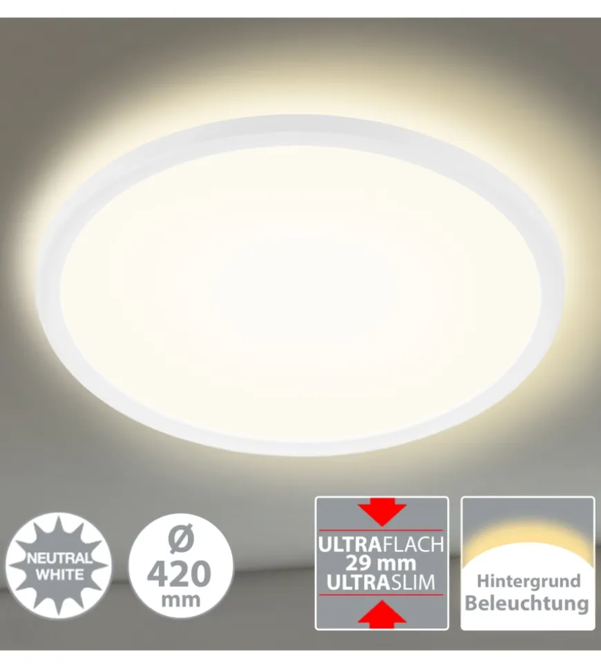 Con diametro 42 cm e spessore di soli 2,8 cm la luce emessa è bianco neutro, con temperatura 4000K e 3000 lumen.
