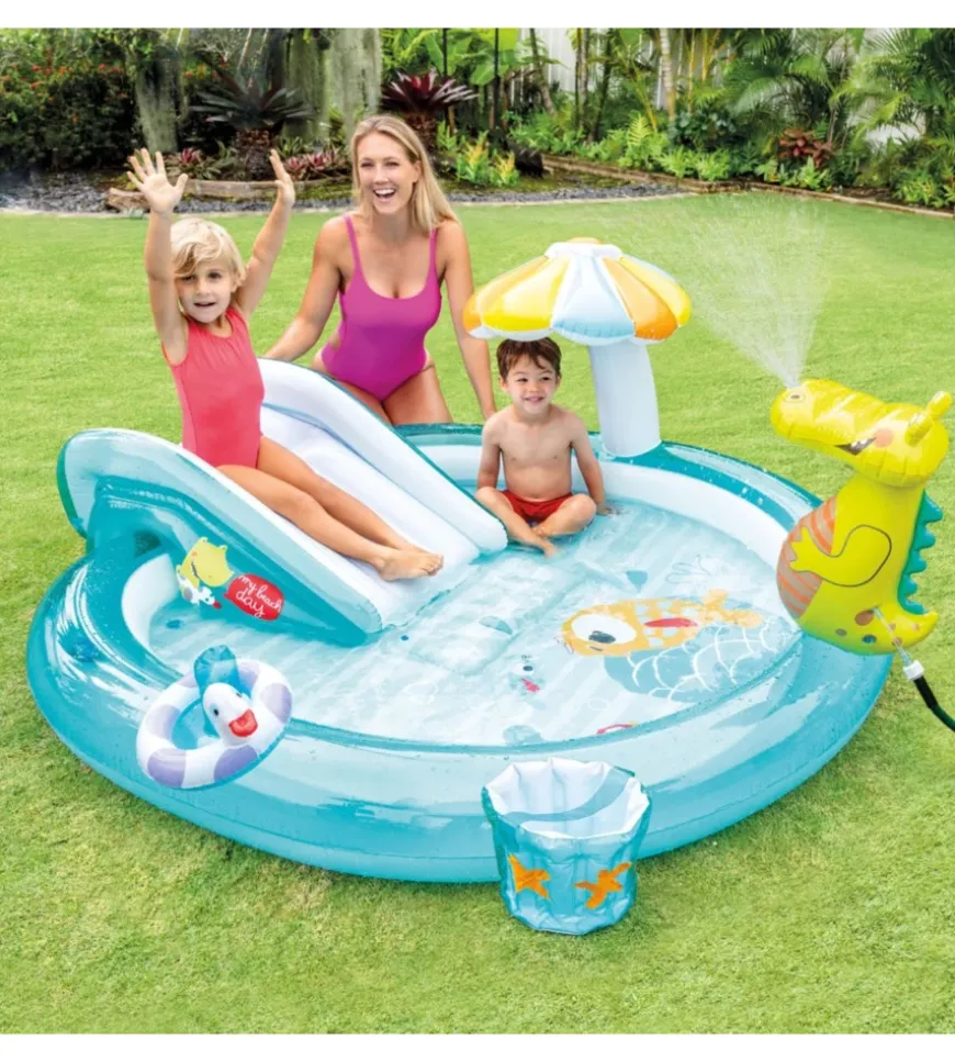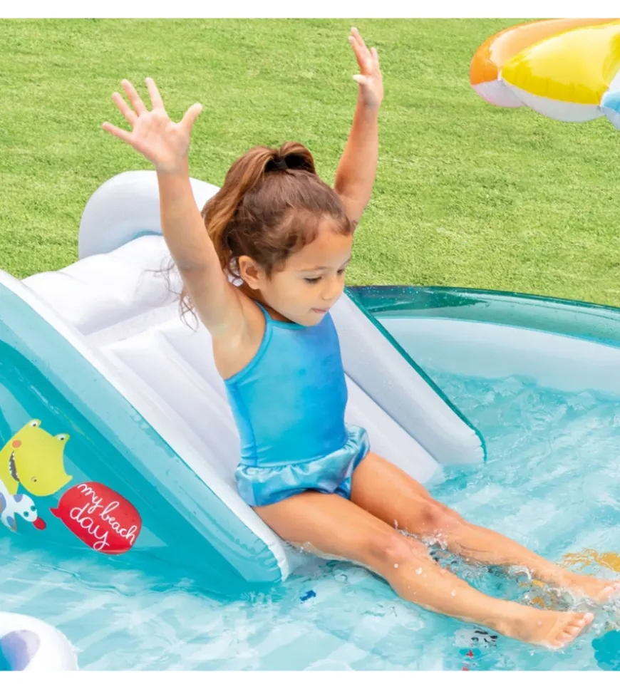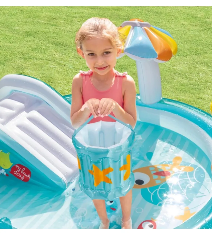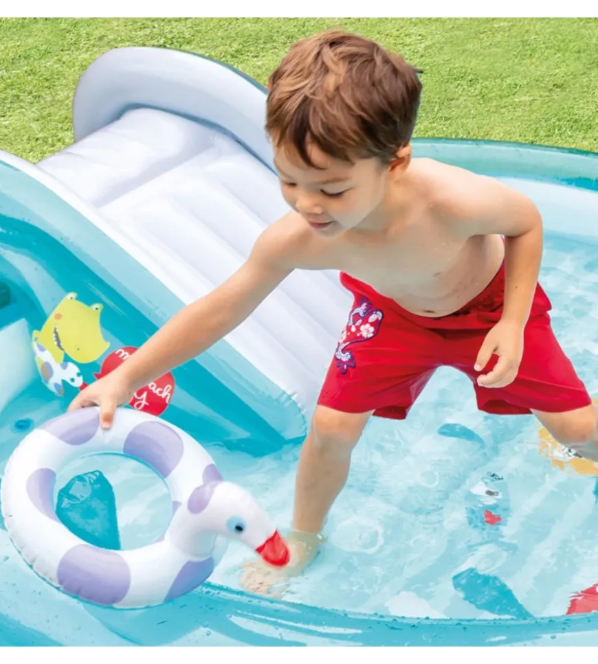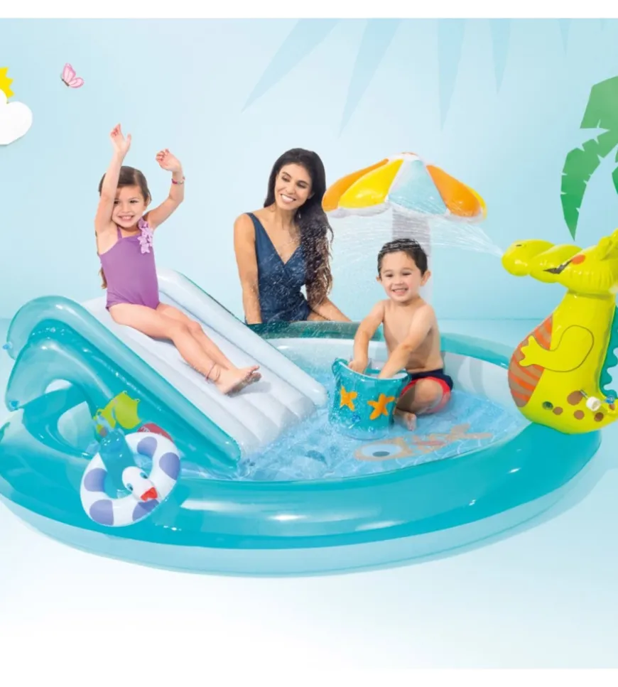 Fai divertire i tuoi bambini con il Play Center Alligatore! Si dimenticheranno del caldo estivo e giocheranno felici in giardino, in completa sicurezza. La piscina gonfiabile presenta un mini scivolo acquatico con tappetino di atterraggio imbottito, un irrigatore a spruzzo collegabile al tubo da giardino e altri giocosi dettagli a tema acquatico, come un anello a forma di papera, per giocare a fare centro nel bersaglio, e un secchiello. La piscina gonfiabile è prodotta in vinile resistente, spesso ben 0,28 mm. Il peso massimo supportato è di 54 kg. Capacità dacqua al livello di riempimento suggerito di 12 cm: 160 l. Toppa di riparazione inclusa. Dotato di tappo di scarico per lacqua. Età: 2+ anni