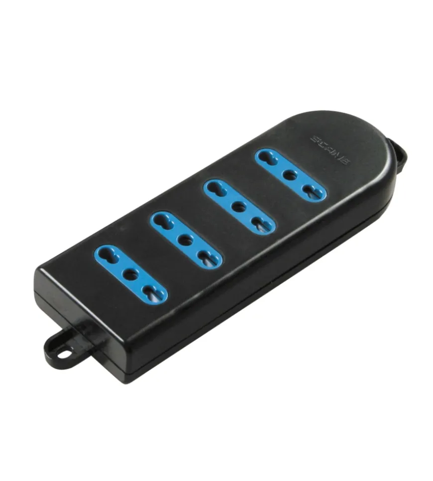 Presa multipla 250 V~ con 4 prese bivalenti 10 / 16 A 2P+T.Colore: nero.Le prese bivalenti consentono il collegamento di tutte le spine standard italiano.I contatti delle prese sono dotati di apposite protezioni per la sicurezza dei bambini.Qualità prodotto certificata dall’Istituto Italiano del Marchio di Qualità (IMQ). PLUS PRODOTTO: # Made in EU# Qualità prodotto certificata dall’Istituto Italiano del Marchio di Qualità (IMQ)# I contatti delle prese sono dotati di apposite protezioni per la sicurezza dei bambini
