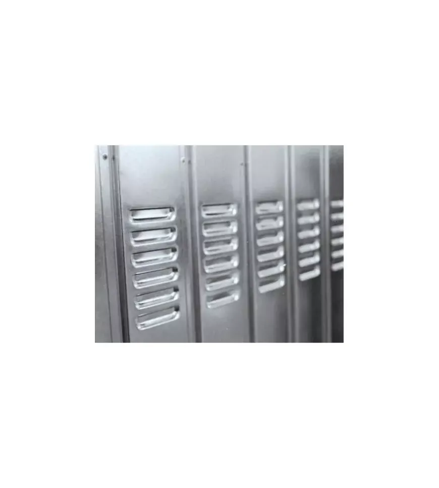- Battente in lamiera di acciaio zincato, spessore 5/10, pressopiegato a nervature verticali e rinforzato trasversalmente da tre profili ad omega collocati rispettivamente in alto, al centro ed in basso. Rinforzi interni per il supporto delle cerniere. Corredato di feritoie di aerazione in alto ed in basso.