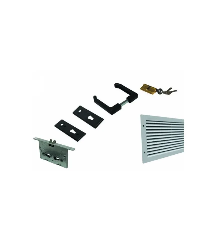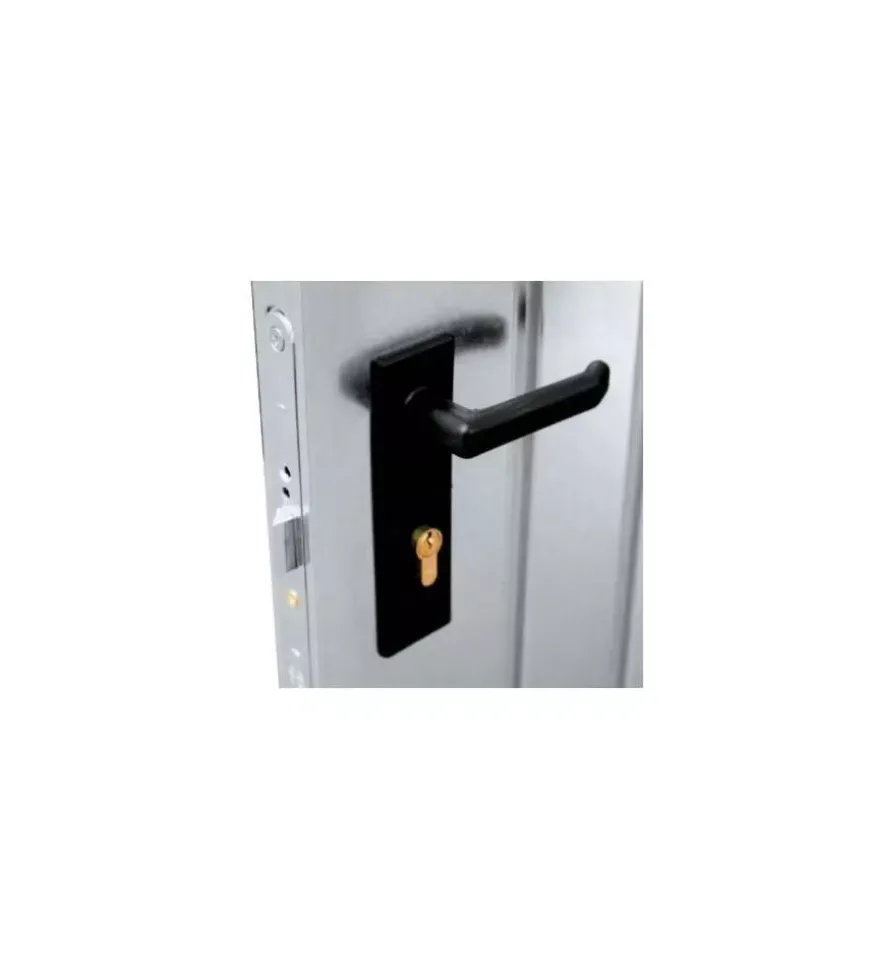 - In confezione a parte sono fornite maniglie e placche realizzate in nylon, colore nero opaco e un cilindro in ottone tipo Yale con tre chiavi.