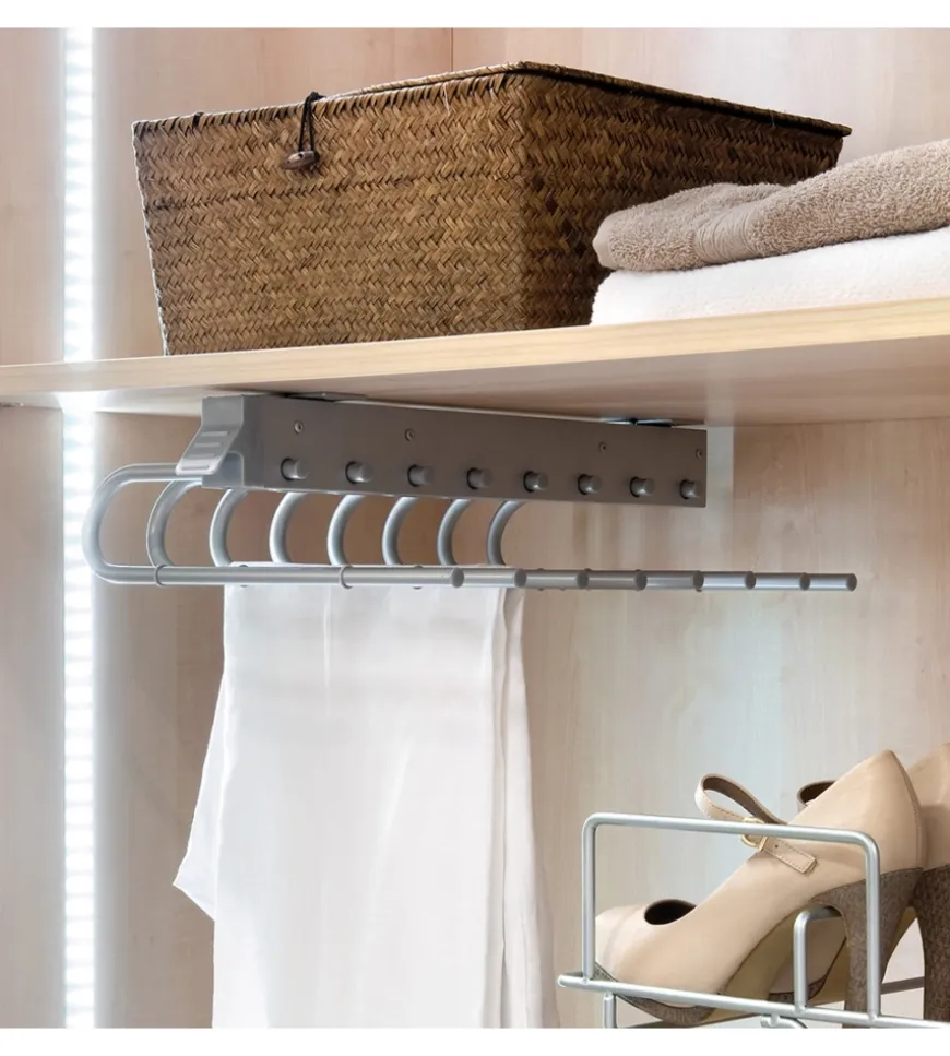 Il porta pantaloni estraibile Self permette di organizzare in modo efficiente lo spazio all’interno degli armadi, facilitando l’accesso agli indumenti. E’ prodotto in acciaio con finitura vernicata alluminio e plastica grigia, e dispone di guide da 450 mm ad estrazione totale. Con maniglia nella parte frontale per facilitare l’estrazione del meccanismo. Prodotto in acciaio e plastica colore grigio metallizzato. Montaggio lato sinistro. Guide di 450 mm con estrazione totale. Con maniglia per facilitare l’estrazione. Include viti per il montaggio.
